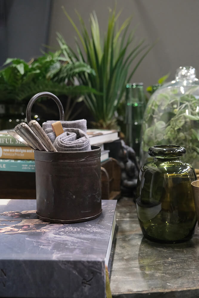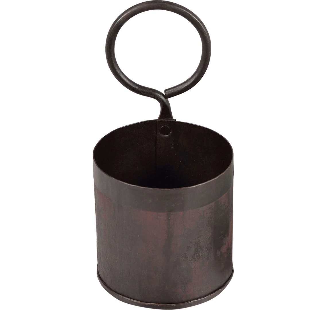 Denne rustikke beholder i jern har et enkelt og funktionelt design med et råt udtryk, der passer perfekt til både enkle og industrielle indretninger. Den mørke metalfinish og den runde ring til ophæng giver et karakterfuldt og tidløst look. Brug beholderen som dekorativ opbevaring af kontorartikler, bestik eller til at fremhæve grønne planter eller urter. Vær dog opmærksom på, at potten ikke er vandtæt, og bør fores med plastik eller en lille indsats, hvis den skal bruges til vandholdige planter. Den angivne højde er inklusiv ophænget, mens selve bøtten måler 11 cm i højden.