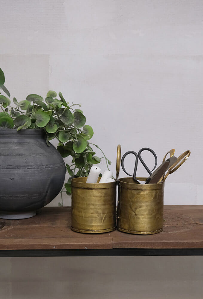 Denne charmerende bestikholder i messingfinish kombinerer funktionalitet og et udtryk med kant. De to rum er perfekte til at organisere bestik eller køkkenredskaber, mens den praktiske ring gør den let at flytte rundt. Det håndlavede look og den varme messingfinish giver et strejf af vintage-stil, der passer perfekt til både rustikke og moderne indretninger. Brug den på spisebordet, køkkenbordet eller som en dekorativ opbevaringsløsning til kontorartikler eller småplanter. En alsidig og stilfuld detalje til ethvert rum. Hver bøtte er 11 cm høj og Ø 11 cm.