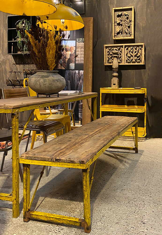 En bænk med personlighed. Denne skønne bænk har et markant gult jernstel og en slidt træsiddeplade, der tilsammen giver et råt og levende udtryk med masser af kant. Stellet kan nemt foldes sammen, hvilket gør den ideel til events, markeder, caféindretning eller som ekstra siddeplads, når der er gæster. Den patinerede finish og de autentiske detaljer gør, at hver bænk har sit helt eget udtryk, og garanteret ikke bliver kedelig at se på. Perfekt til dig, der elsker møbler med både sjæl og funktion. Gul? Ja tak, det er jo umuligt ikke at blive lidt i godt humør.