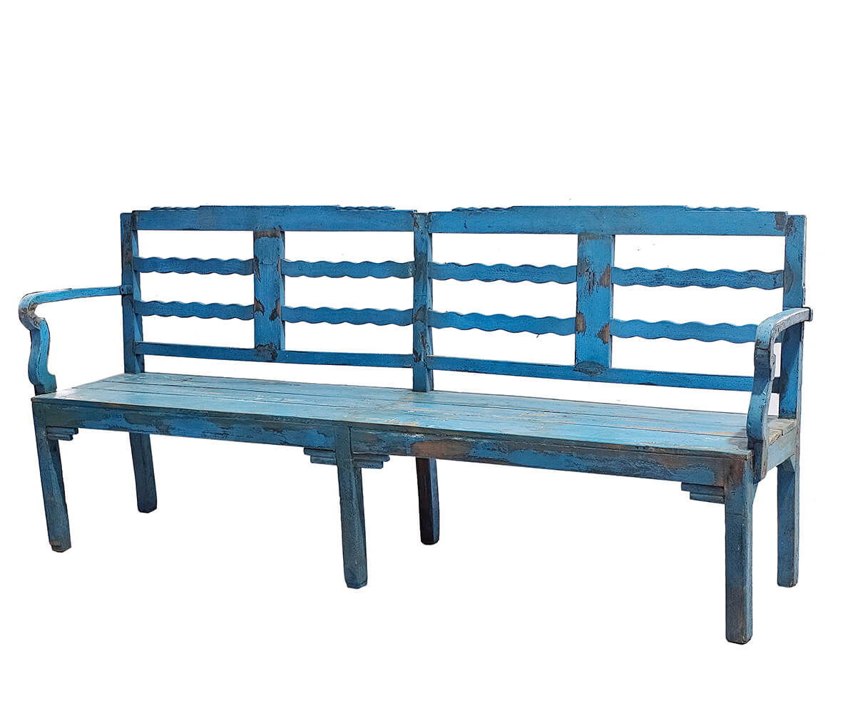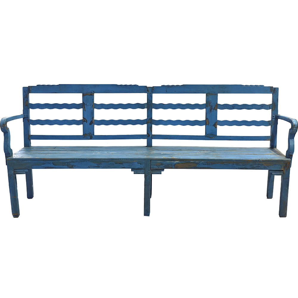 Her får du en bænk, der nægter at gå i ét med tapetet. Den livlige blå farve og de bølgede tremmer i ryglænet giver bænken et nærmest legende udtryk, mens den slidte maling og patina afslører, at den allerede har levet et langt og godt liv. Med sin generøse længde er der rigeligt plads til både kaffepauser og gode samtaler. Den solide trækonstruktion og de rundede armlæn gør den både behagelig og praktisk, uanset om den skal stå i entréen, i orangeriet eller måske som blikfang i butikken. En bænk med holdning og historie.