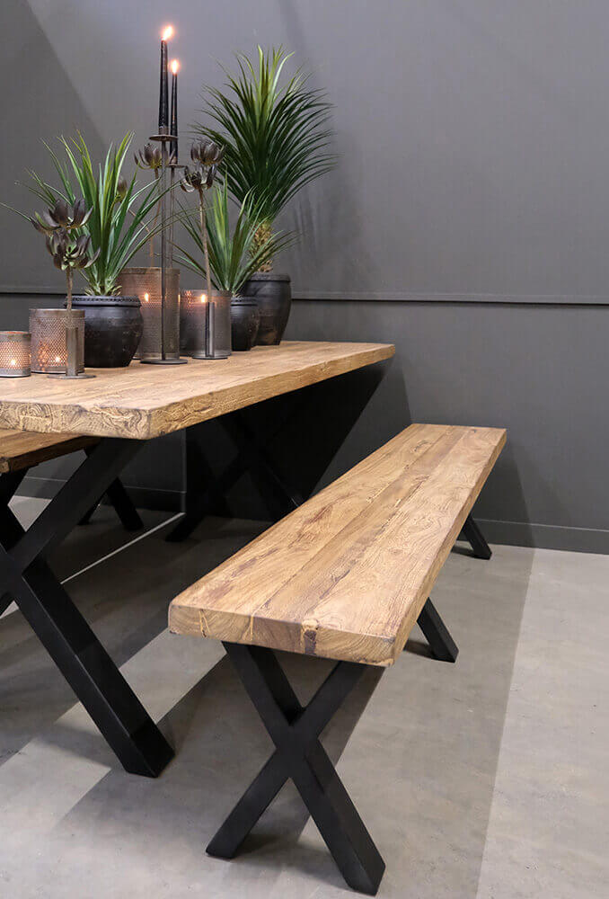 Lang bænk i rustik træ med et solidt krydsstel i jern, der kombinerer skønhed og funktionalitet. Denne imponerende bænk tilbyder rigelig siddeplads og er et smukt eksempel på godt håndværk. Det rustikke træ og det robuste jernstel skaber en fed kontrast, der vil tilføje karakter til ethvert rum. Brug den som en stilfuld siddeplads ved spisebordet, i entréen eller hvor som helst, hvor du ønsker at tilføre en unik rustik charme. Vores bænk i rustik træ er den perfekte kombination af æstetik og praktik. (ca. 4,5 cm tykt) Find et matchende bord her varenummer: M03132 samt en matchende mindre bænk under: M1854