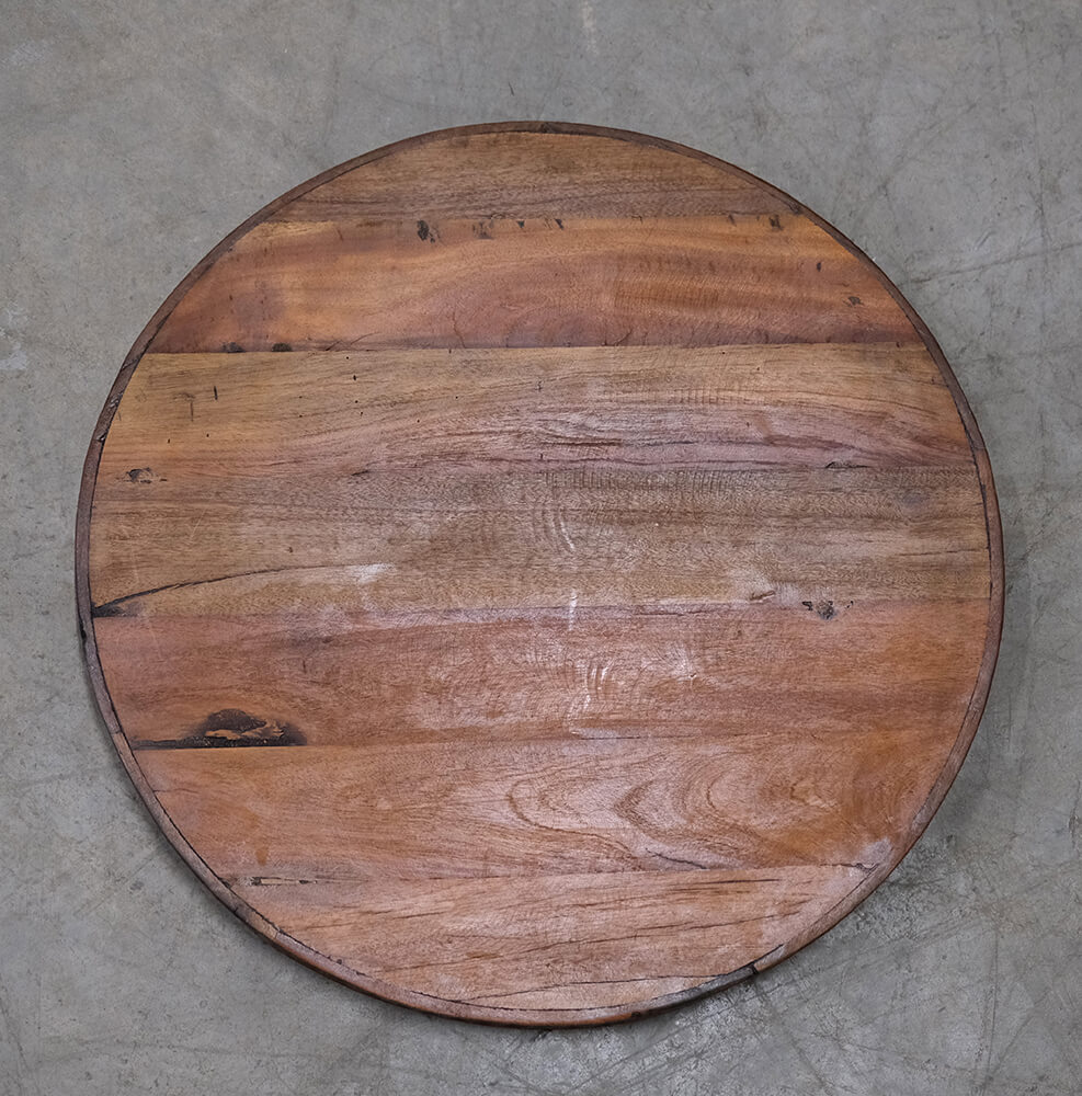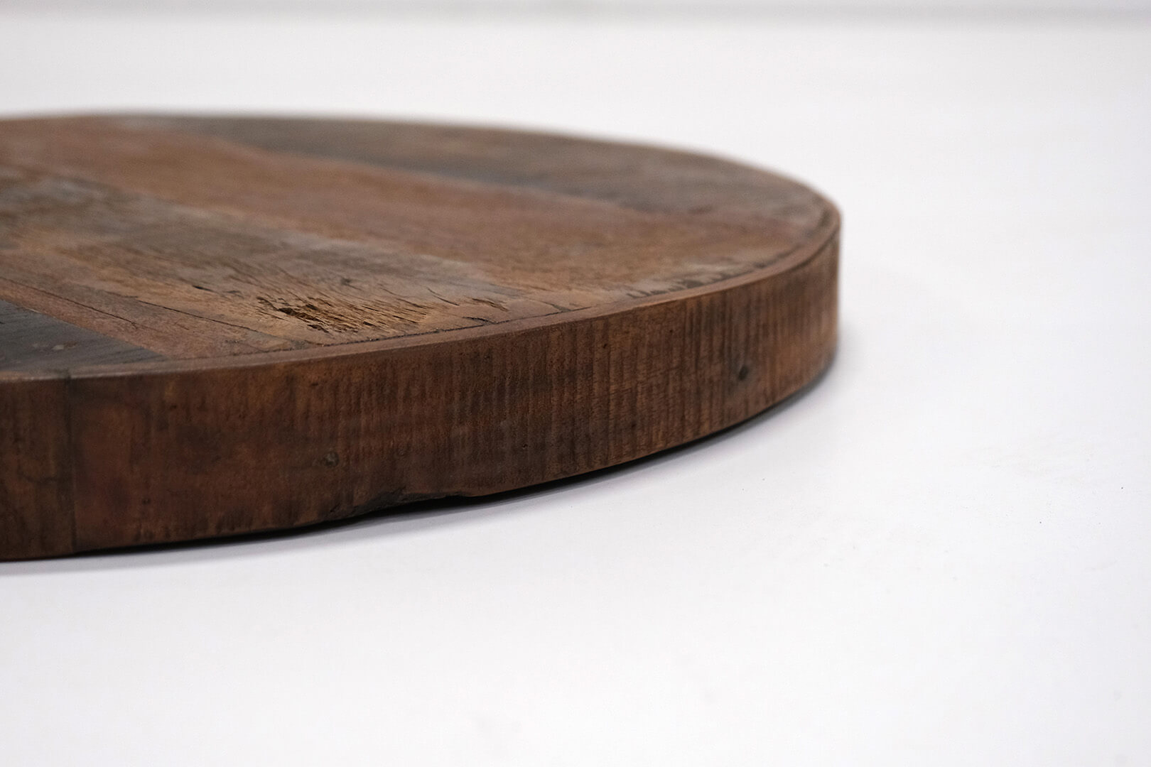 Smuk, rund bordplade i mørkt genanvendt træ. Denne smukke bordplade er perfekt til et intimt lille cafébord. Bordpladen kan også fås i en lidt større udgave med en omkreds på 70 cm. Bordpladen passer til de fleste af vores stel.