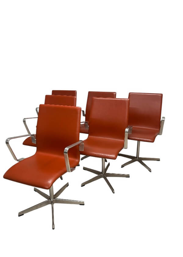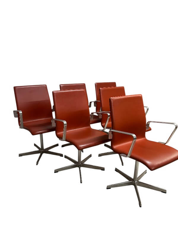 Eksklusivt sæt med 6 originale Oxford stole med armlæn og drejefod, designet af Arne Jacobsen og produceret af Fritz Hansen. Stolene er fra 2014 og er betrukket med originalt rødt semi-anilin læder, som fremstår smukt med en let og ensartet patina.