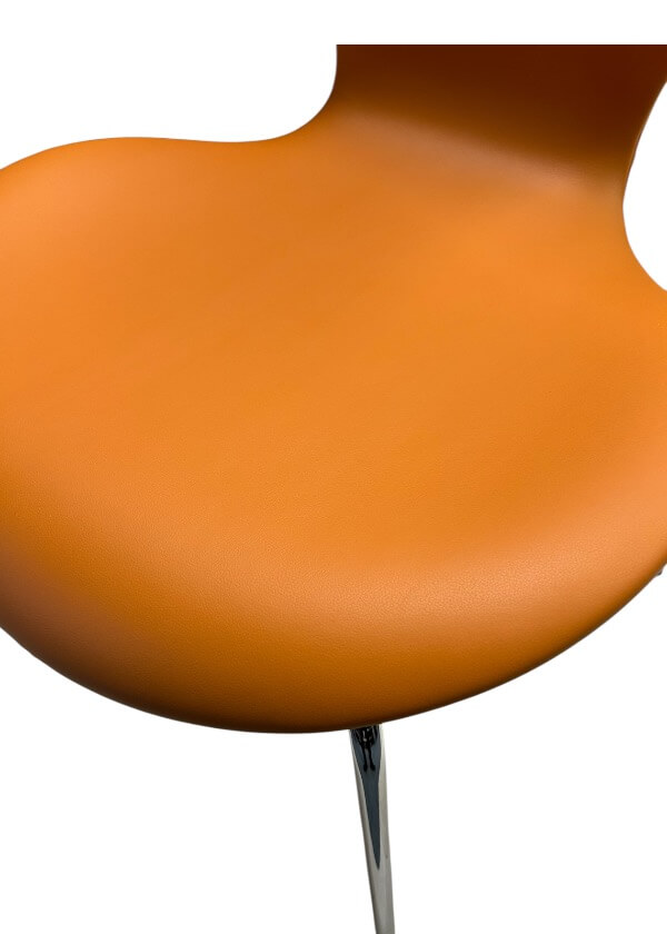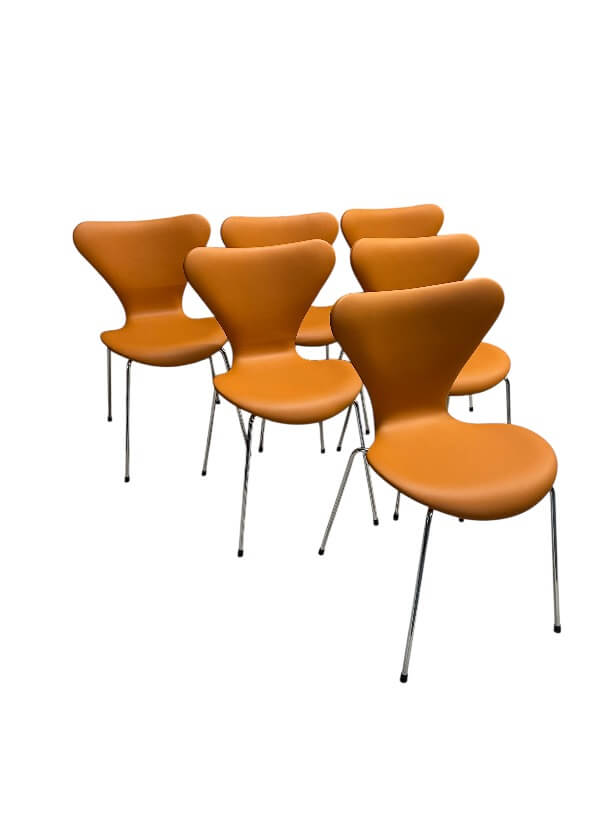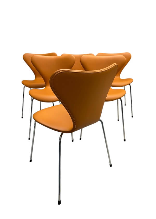 Denne serie består af 6 originale Syverstole (Series 7) fra Fritz Hansen, som er professionelt ompolstret hos Minidesign i Linea semi-anilin møbelhuder, en premium læderkvalitet fra Nevotex.