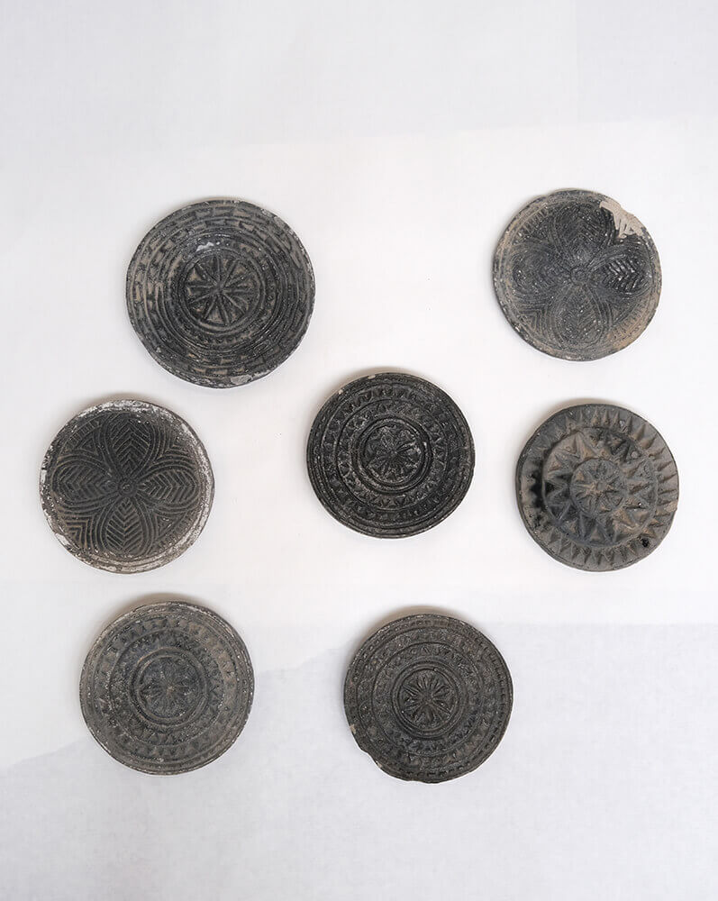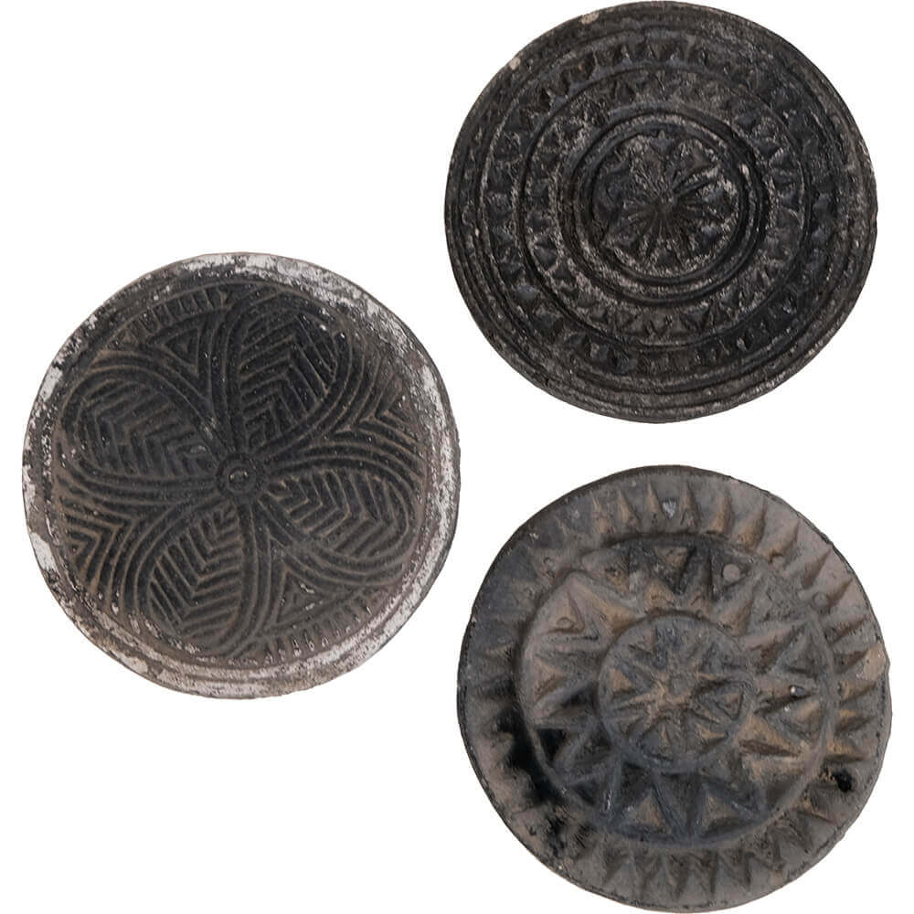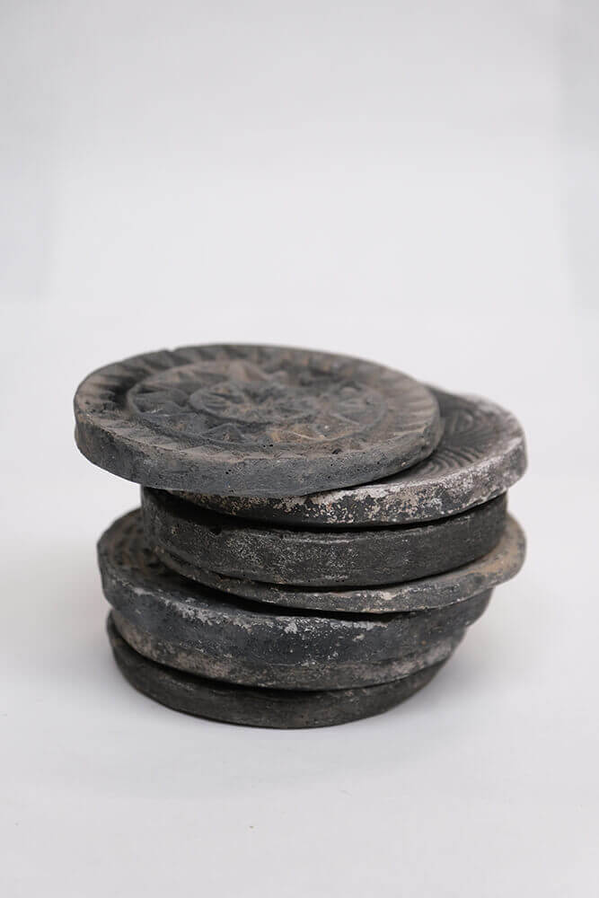 Disse små, runde kikseforme i stenmel emmer af historie og håndværk. Oprindeligt brugt til at forme smukke, mønstrede kager og kiks i traditionelle køkkener. Nu er de klar til at pryde dit hjem som dekorative elementer med masser af patina og personlighed.