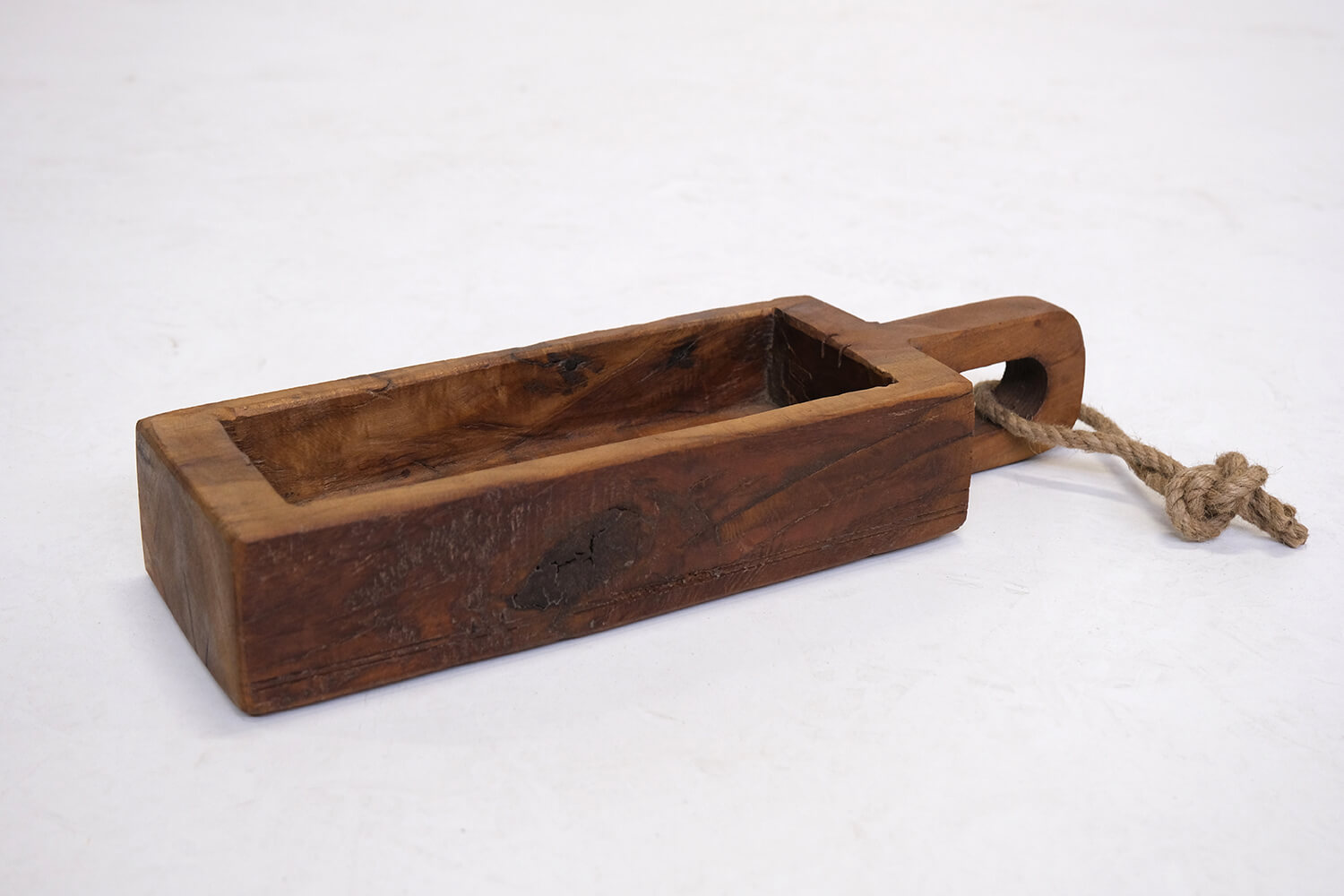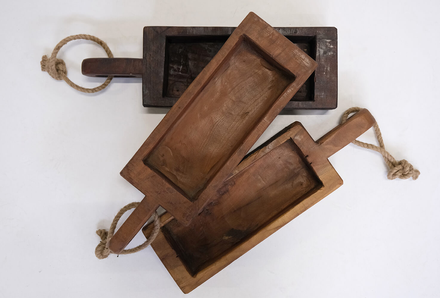 Rustikke, håndlavede træfade af genanvendt træ. Hvert fad bærer præg af det genanvendte træs varierende udtryk og håndværkerens individuelle touch. Alle træfadene har håndtag med reb, så de kan hænges i en krog for praktisk opbevaring. Træfadene er flotte i sig selv, når de f.eks. står på dit sofabord, men kan naturligvis også bruges til opbevaring eller til en dekoration.