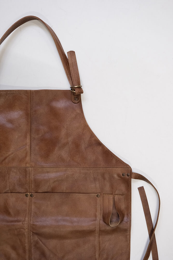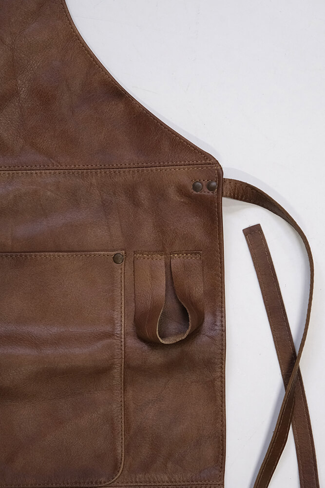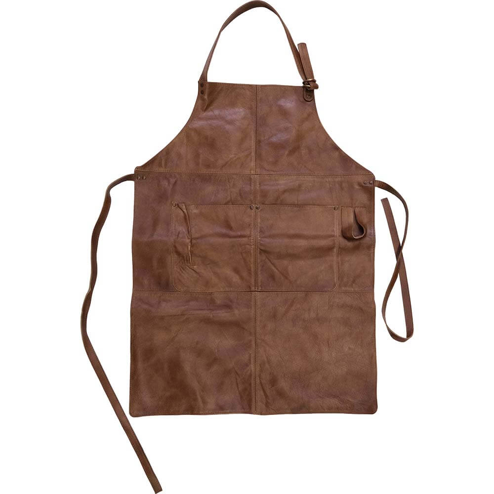 Dette forklæde i blødt bøffellæder forener klasse og praktisk anvendelighed. Læderets naturlige charme og varme, mørkebrune farve giver forklædet et råt og autentisk udtryk, mens det bløde materiale gør det behageligt at bære, selv i længere tid. Med de praktiske lommer foran kan du altid have dine redskaber lige ved hånden – perfekt til både madlavning, håndværk og andre opgaver. De justerbare stropper om nakken og bindebåndet i taljen sikrer en god og tilpasset pasform.