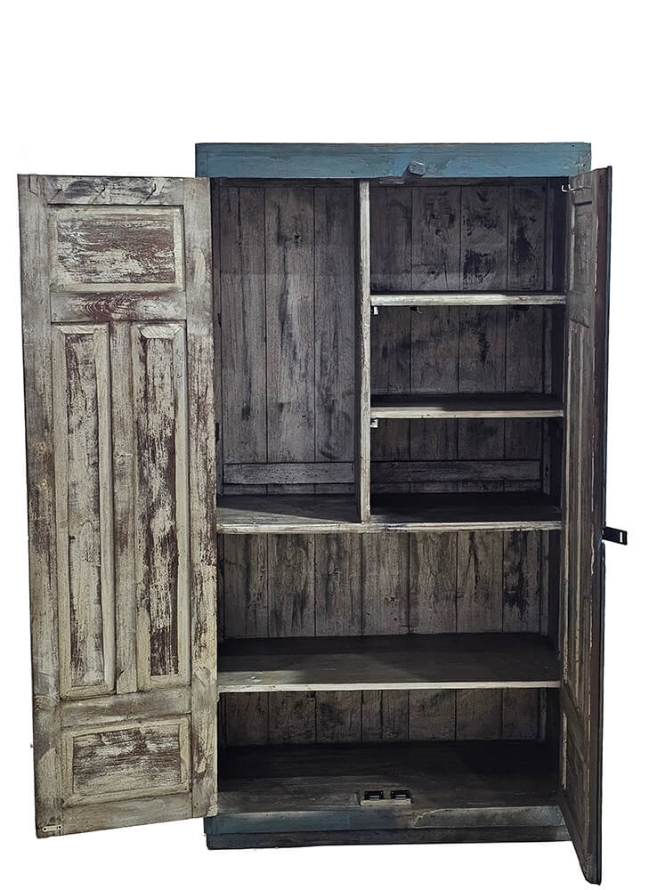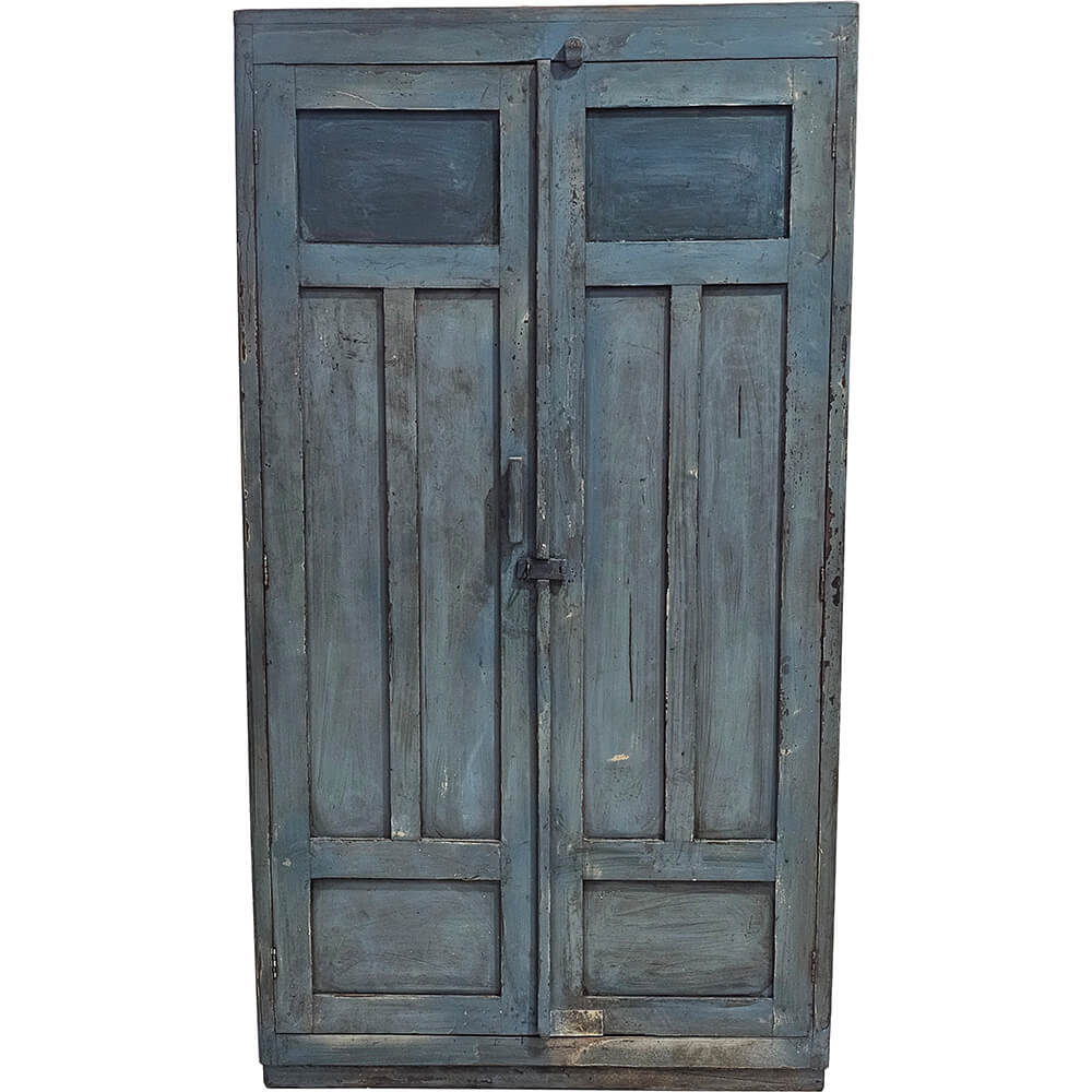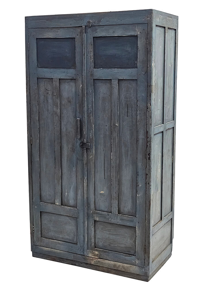 Dette flotte, gamle træskab i afdæmpet blå har et markant og roligt udtryk, der straks fanger øjet. Den slidte maling og de tydelige spor af brug giver skabet en autentisk karakter, som passer perfekt ind i både rustikke, nordiske og mere personlige hjem. De to låger har et enkelt, klassisk snedkerudtryk, der understreger skabets solide håndværk.