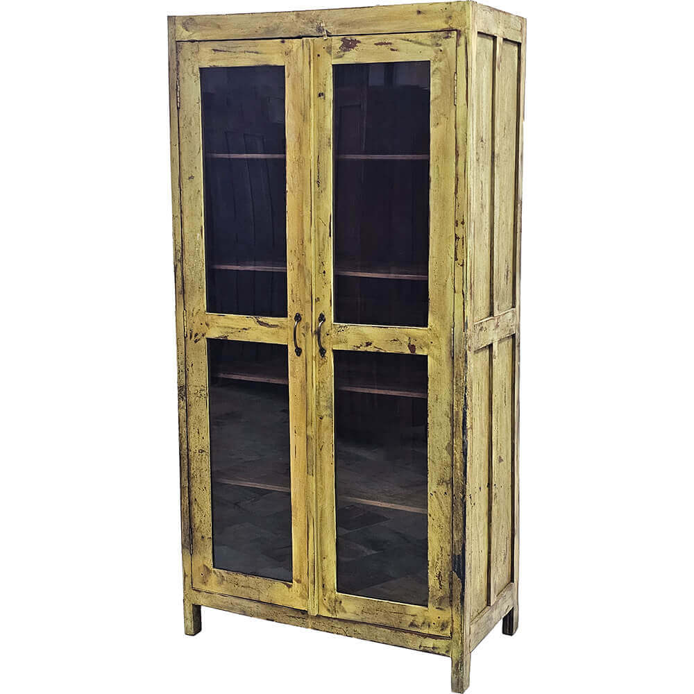 Denne gamle vitrine er et rigtigt blikfang, ikke mindst på grund af den smukke, slidte gule finish, der giver møblet masser af charme og personlighed. De store glaslåger gør det let at vise dine favoritfund frem, uanset om det er keramik, glas, bøger eller nips, der fortjener en plads i spotlightet. Indvendigt finder du rummelige hylder med plads til både dekoration og opbevaring, og træets patina fortæller tydeligt, at skabet har levet et langt og godt liv. Små mærker, farvespil og slidspor er en del af dens unikke udtryk, og er præcis dét, der giver den karakter i et moderne hjem. Perfekt i stuen, køkkenet eller entreen, hvis du vil tilføje varme, farve og autenticitet til din indretning. En vitrine med masser af sjæl og et udtryk, du ikke finder i nye møbler.