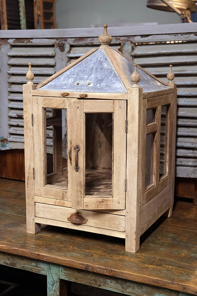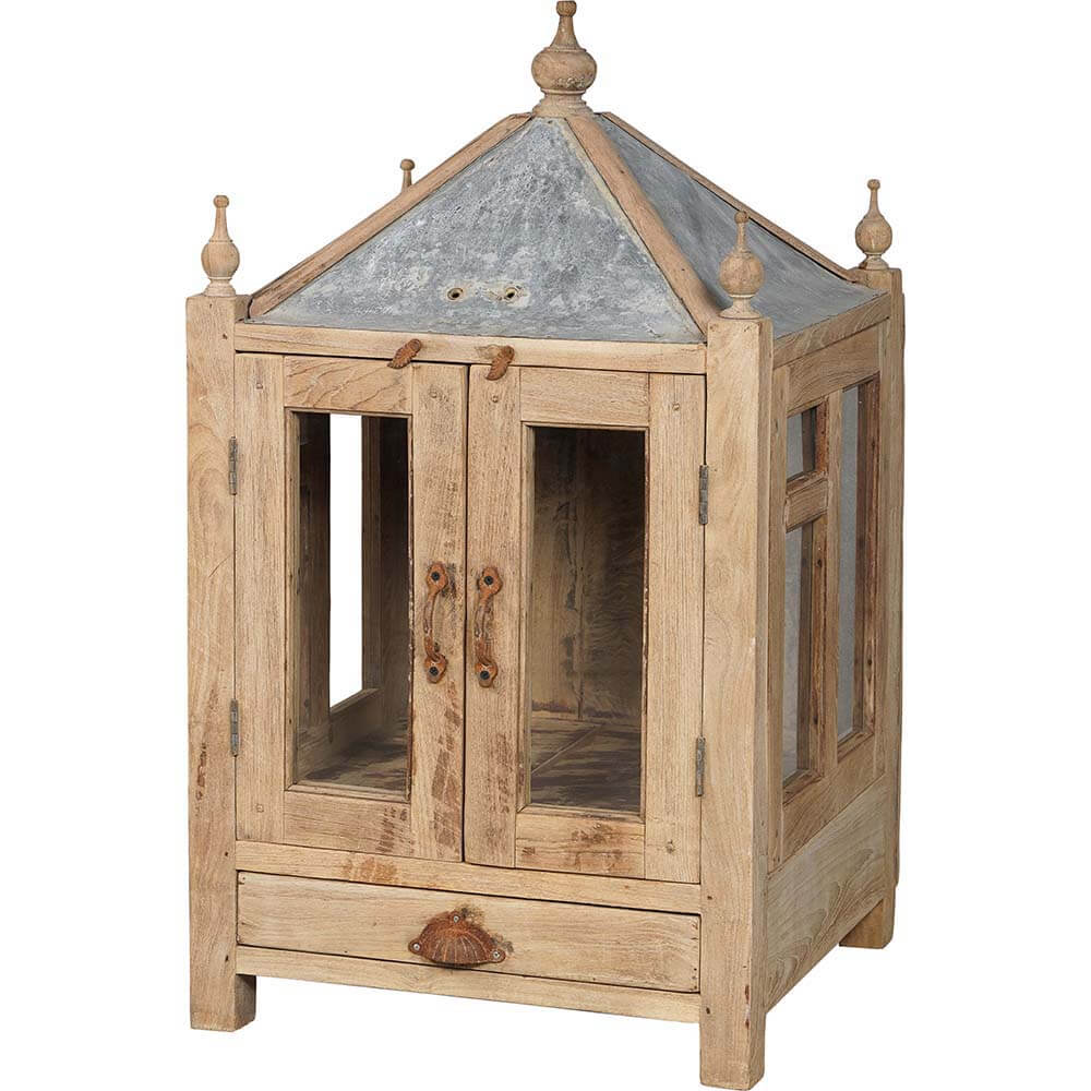 Dette lille vitrineskab er udformet som et smukt tempel med en kombination af træ og en zinktagkonstruktion. Med sine dekorative tårne og små glasvinduer udstråler det både charme og karakter. Den indbyggede skuffe med et rustikt muslingskalformet greb tilføjer ekstra opbevaringsmuligheder, mens de dobbelte glaslåger gør det ideelt til at fremvise små skatte, nips eller lysdekorationer. Perfekt til både hjemmet og butikker, hvor det kan fungere som et dekorativt blikfang med et strejf af historie og varme.