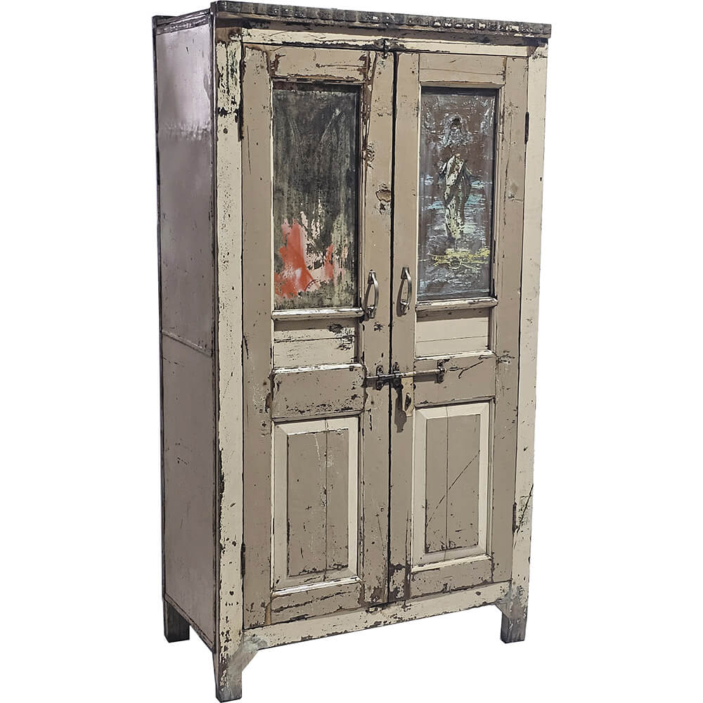 Dette unikke skab er en sand fortælling i træ og farver. Den pastelfarvede maling er slidt med ynde og afslører årtiers brug og kærlig slitage. På de øverste fyldninger af lågerne gemmer sig to håndmalede motiver, hvor det ene forestiller en indisk kvindefigur, lidt udvisket, men stadig dragende. Malerierne er med til at give skabet en særlig stemning af noget personligt og historisk. Skabet har to låger og står stabilt på små ben med afskårne hjørner. Den kraftige trækonstruktion giver skabet tyngde og karakter, og de simple beslag og håndtag bidrager til det rustikke udtryk. Et møbel, der skiller sig ud og vil få både historieelskere og indretningsentusiaster til at kigge en ekstra gang.