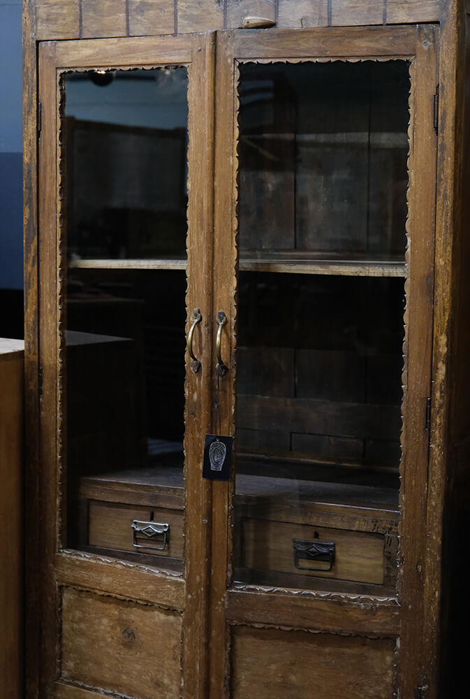 Et imponerende vitrineskab med masser af karakter og fine detaljer. Skabet er udført i træ med glaslåger, der giver et flot indblik til indholdet, og har både hylder og rummelige skuffer til opbevaring. De udskårne kanter og den dekorative top giver skabet et særligt udtryk, mens den naturlige overflade viser træets struktur og historie. Det store vitrineskab passer perfekt i et hjem eller i en butik, hvor det både tilfører varme og praktisk opbevaringsplads. Et møbel med et unikt håndværk og tidløs charme, der nemt bliver et blikfang i rummet.