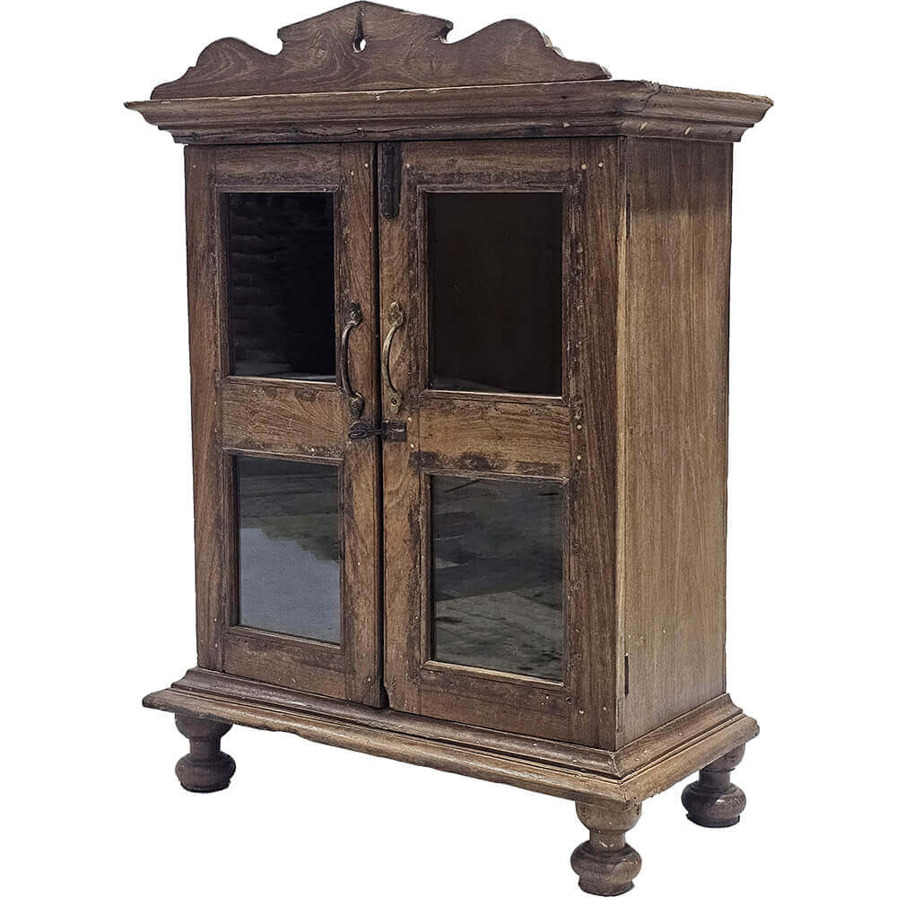 De drejede ben og den smukt formede topkant tilføjer karakter og gør skabet til et særligt blikfang i rummet. Den naturlige træfarve og den let patinerede overflade understreger dets rustikke charme og tidløse udtryk.