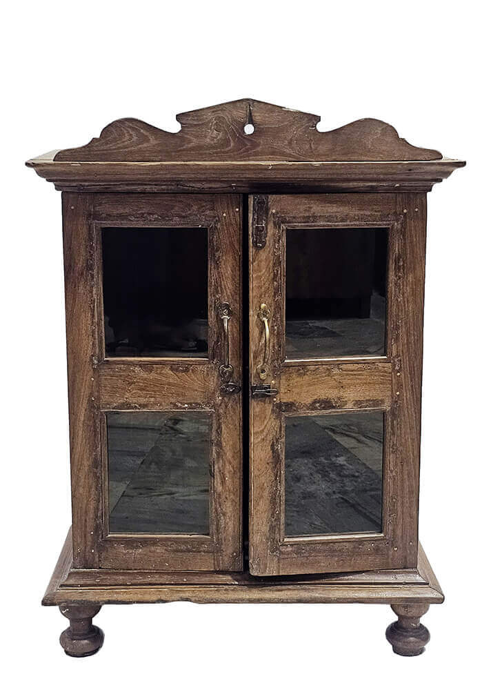Et smukt vitrineskab i massivt træ med fine udskæringer og detaljer, der giver det et charmerende og klassisk udtryk. Skabet har to glaslåger, som giver et let og indbydende look, og det er oplagt til at fremvise glas, service eller dekorative genstande.