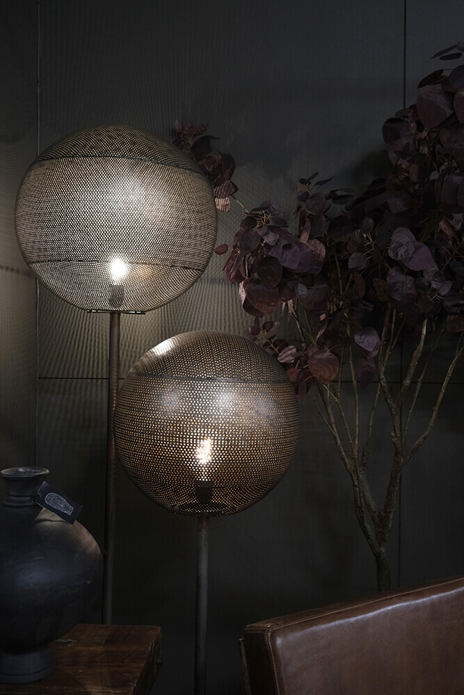 Moonlight gulvlampen i størrelse large er en skøn og iøjnefaldende gulvlampe. Lampen er lavet i jern og står solidt på en rund fod med en diameter på 45 cm. Den slanke stamme bærer en rund, perforeret lampeskærm, som kaster et stemningsfuldt og eventyrligt mønster af lys og skygger ud i rummet. Lampen er perfekt til dig, der elsker at mikse det rå med det raffinerede – og den passer lige så godt ind i en klassisk stue som i en moderne caféindretning. Serien fås i tre størrelser, så du kan finde den helt rette version til netop dit rum.