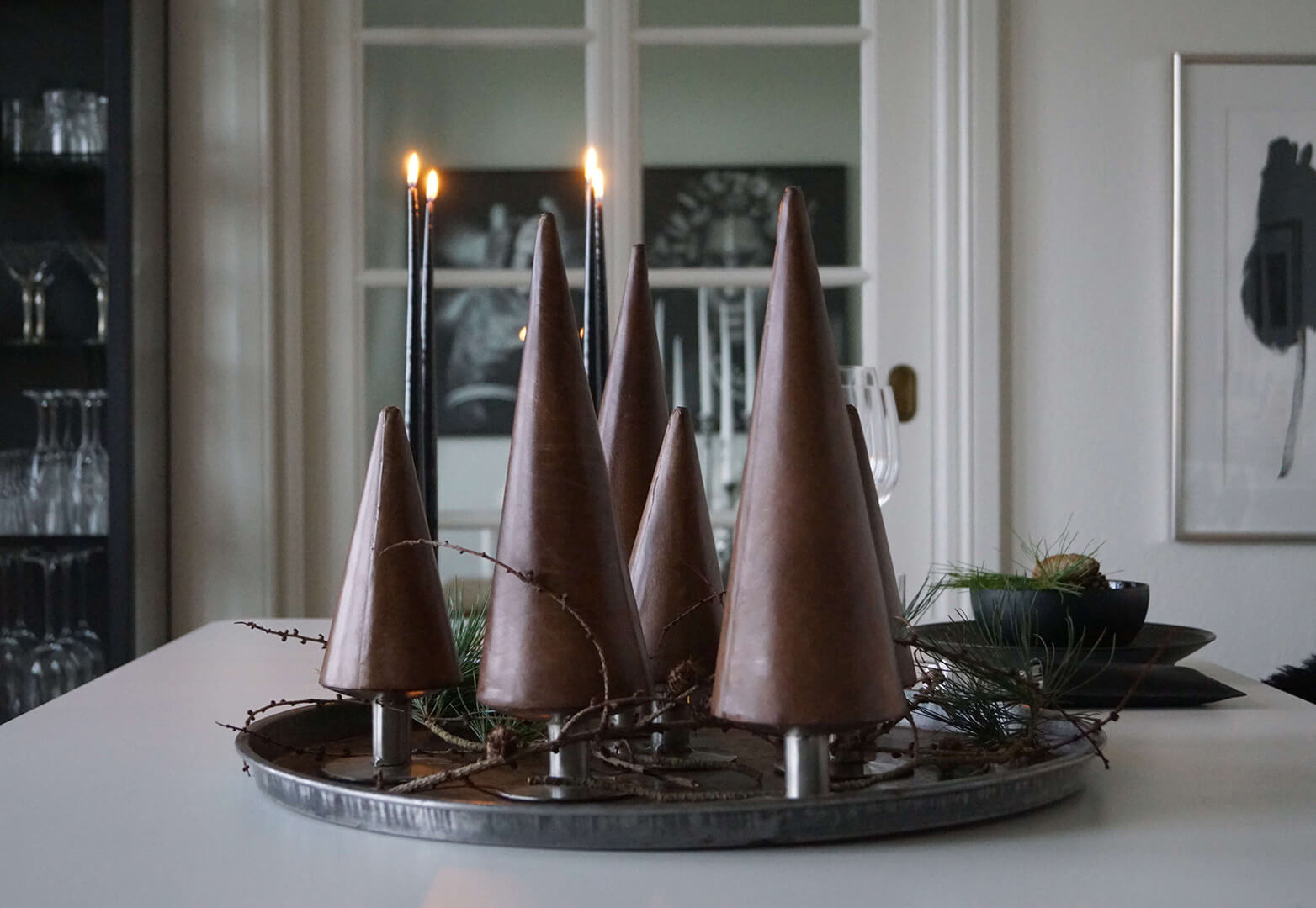 Et anderledes og dekorativt juletræ i et enkelt design, beklædt med brunt læder. Træet står på en solid fod i jern, som giver stabilitet og et råt modspil til den varme læderoverflade. Perfekt som en stilfuld juledekoration, der både kan stå alene eller kombineres med andre materialer som træ, glas og metal. Et lille statement-piece, der bringer julestemning på en moderne måde.
