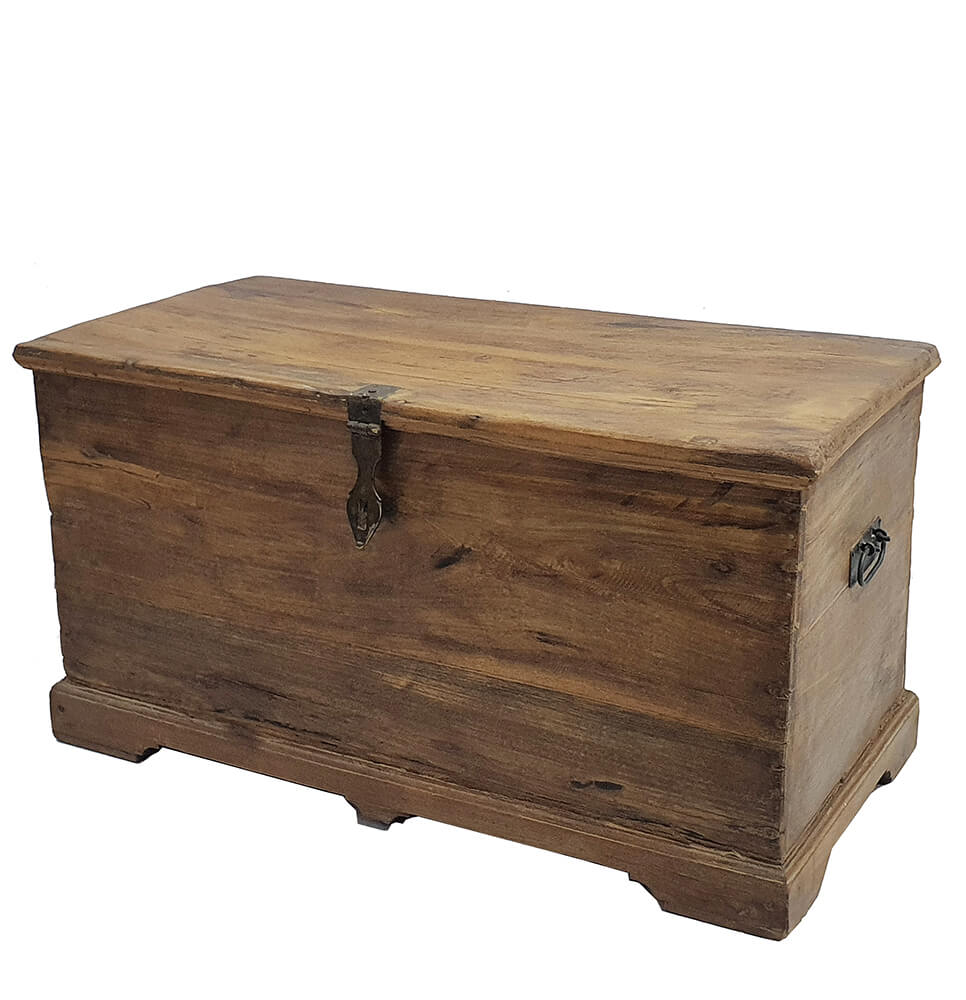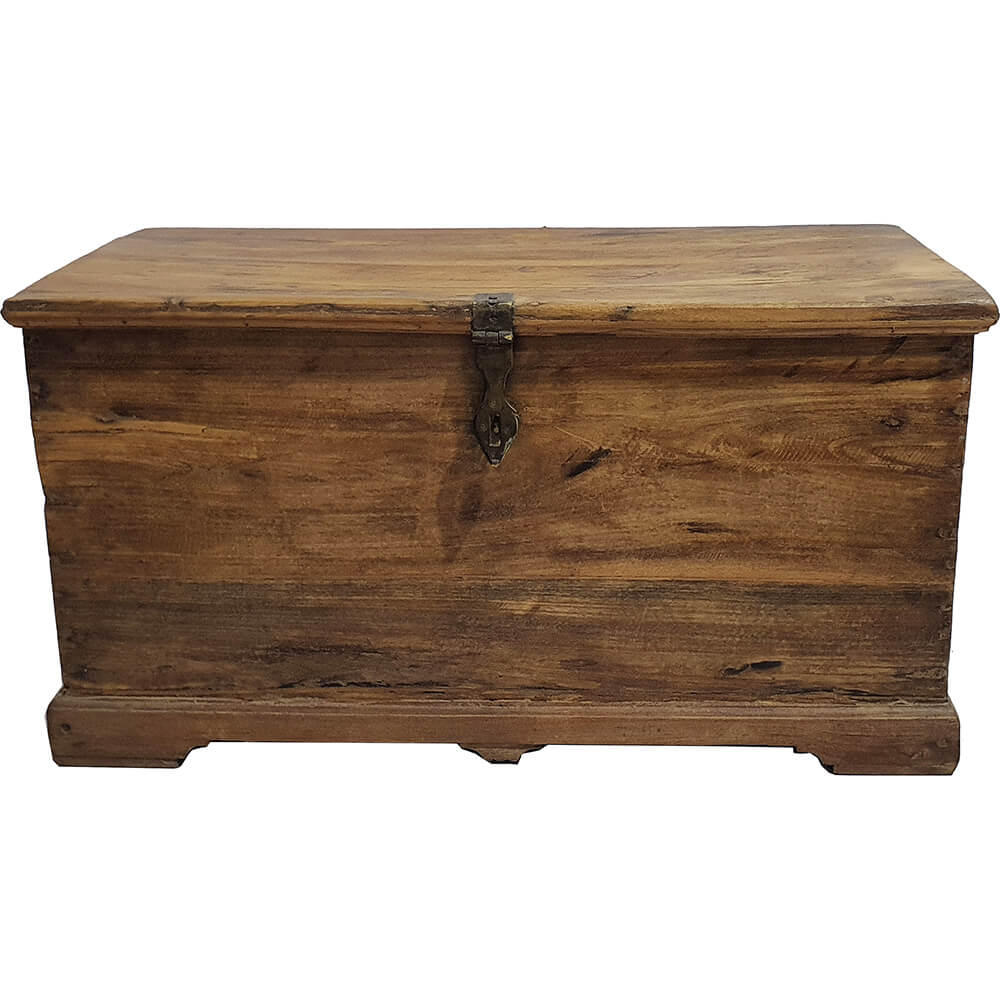 Denne gamle trækiste emmer af historie og håndværk. Med sit enkle udtryk og solide konstruktion får du et funktionelt møbel, der ikke gør væsen af sig, men som alligevel tilføjer varme og karakter til rummet. Den har praktiske sidegreb i metal og et klassisk beslag på fronten, der gør det muligt at låse låget, hvis du ønsker det. Kistens rummelige indre er perfekt til opbevaring af alt fra tæpper og sko til legetøj og skatte, og den flade top kan nemt bruges som en ekstra siddeplads eller som base for en fin opstilling. Et råt og naturligt element, der passer lige så godt ind i en moderne indretning som i en mere rustik stil.