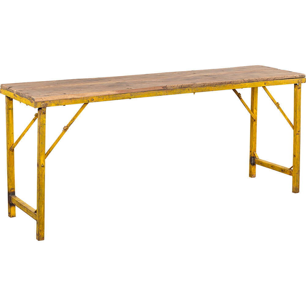 Her er et konsolbord, der skiller sig ud. Med sit iøjnefaldende gule jernstel og patinerede træbordplade kombinerer dette bord rå industriel charme med praktisk funktionalitet. Stellet kan nemlig foldes sammen, så du nemt kan gemme konsolbordet væk, når det ikke er i brug, eller tage det med til pop-ups, markeder eller events. Den slidte finish og de synlige svejsninger tilføjer kant og karakter, mens konsolbordets solide konstruktion sikrer, at det kan holde til hverdagens kaos. Et perfekt valg til dig, der elsker møbler med personlighed, og som gerne vil tilføre lidt farve til det rå udtryk.