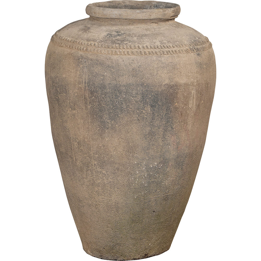 Stor, gammel lerkrukke med smuk naturlig patina. Krukken har et autentisk, håndlavet udtryk og varierer let i form og farve, hvilket gør hver enkelt unik. Med en højde på 85–90 cm er den perfekt som dekoration i sig selv eller til store grene og tørrede blomster.