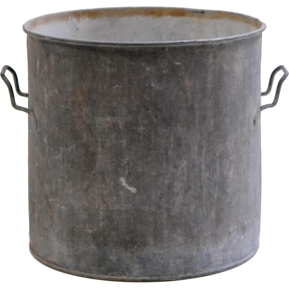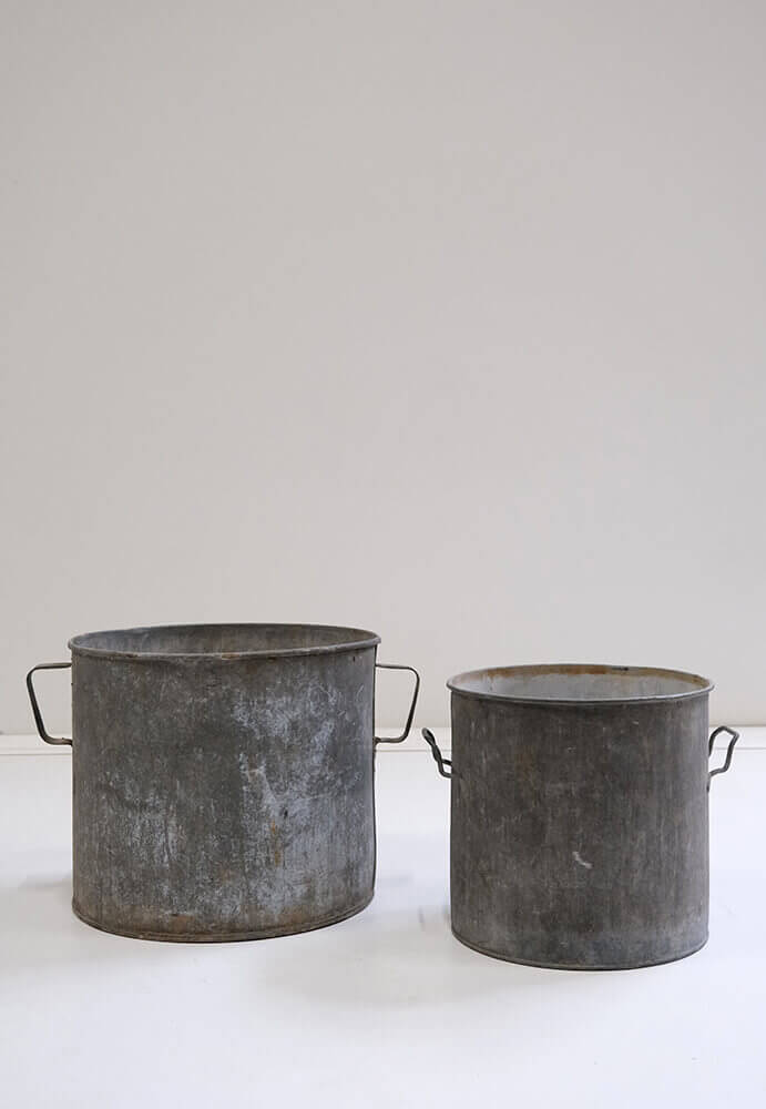Robuste zinkspande med en flot, mørk patina og karakterfulde håndtag i jern. Hver spand bærer præg af årenes spor, hvilket giver dem et helt særligt udtryk, hvor ingen er helt ens.
