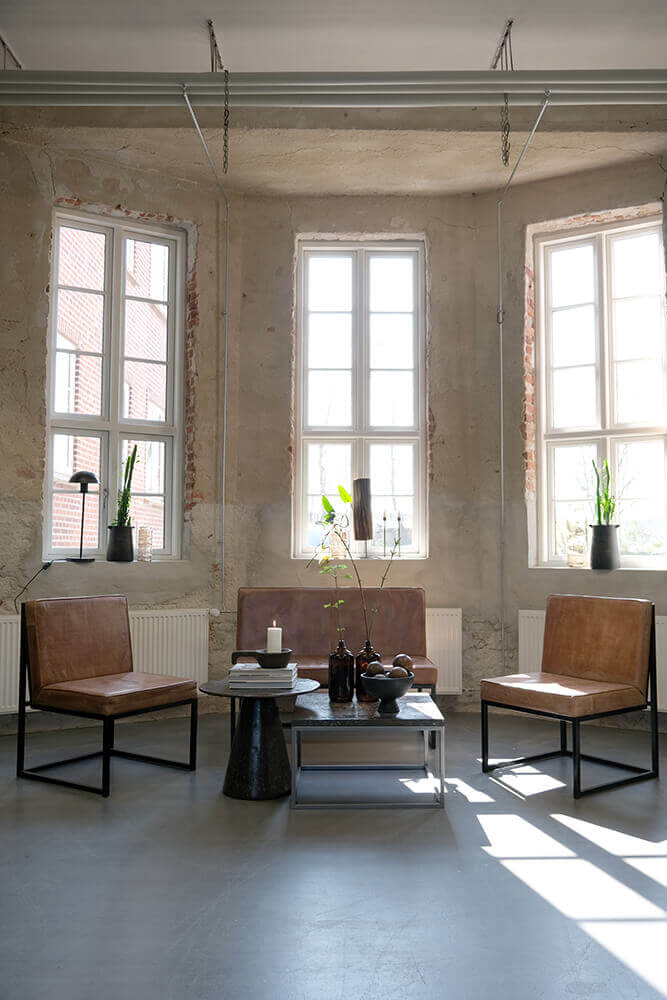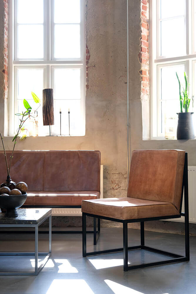 En stilfuld og maskulin loungestol, der kombinerer det rå med det komfortable. Stolen har et polstret sæde og ryg i varm, cognacfarvet læder, som udstråler både kvalitet og holdbarhed. Det enkle sorte metalstel giver stolen et moderne og industrielt præg, der passer perfekt ind i en rå og tidløs indretning. Læderet får med tiden en smuk patina, som kun vil gøre stolen endnu mere charmerende. Perfekt til en afslappet hyggekrog i hjemmet, som en cool detalje i loungen på en café eller som stilfuldt møblement i en restaurant. En loungestol med kant og komfort, der holder i mange år.