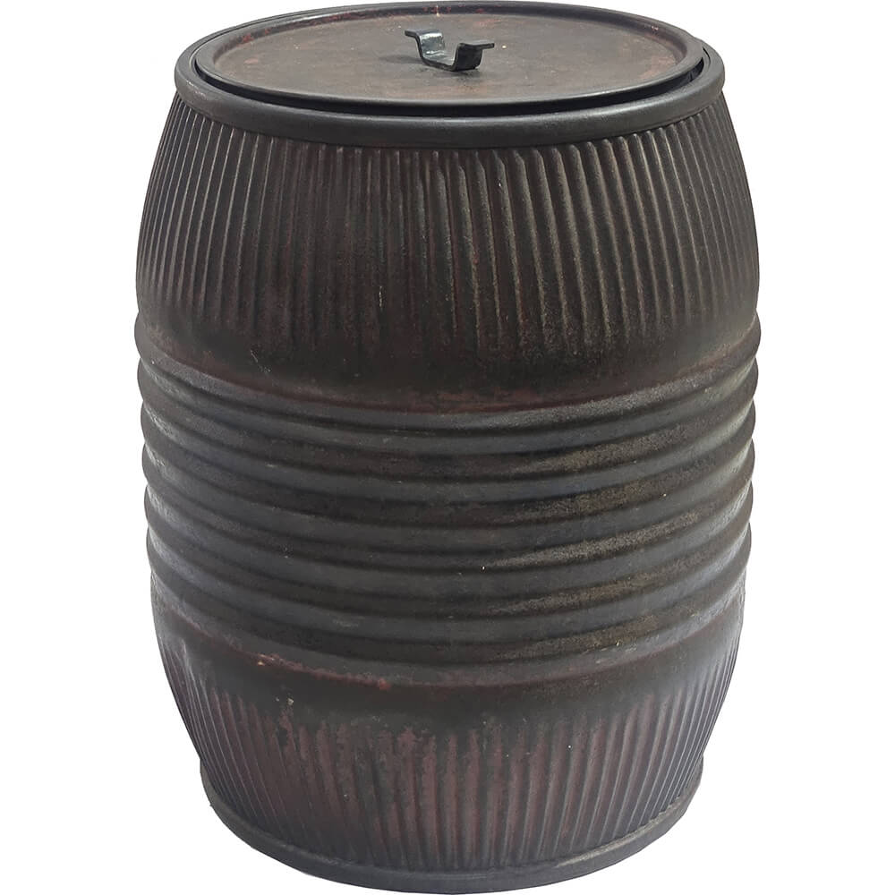 Denne robuste jerntønde har et smukt, mørkt patineret udtryk med rå riflede sider. Den er fremstillet i solidt metal og har et aftageligt låg med et lille greb, så den let kan åbnes.