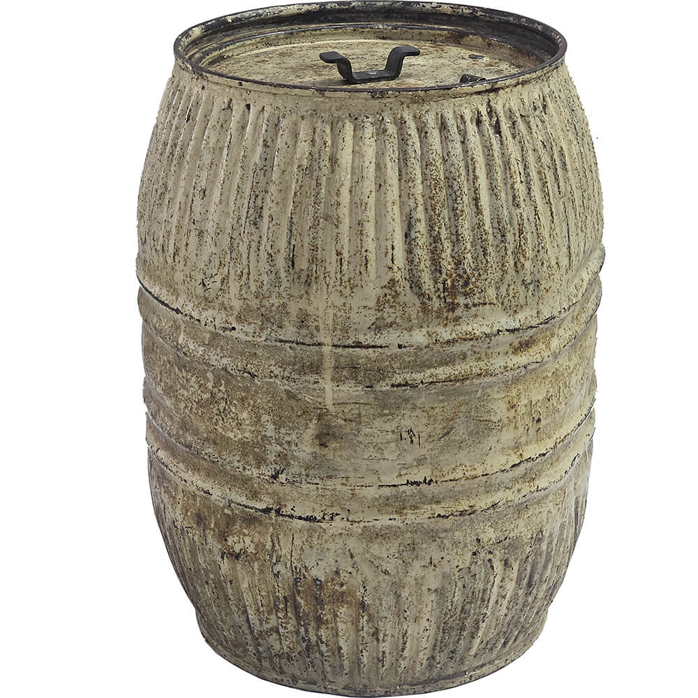 Her er en tønde, der ikke prøver at være noget, den ikke er. Den står ærligt og råt i en lækker cremefarvet nuance med tydelig patinering, rustpletter og charme i overfladen.