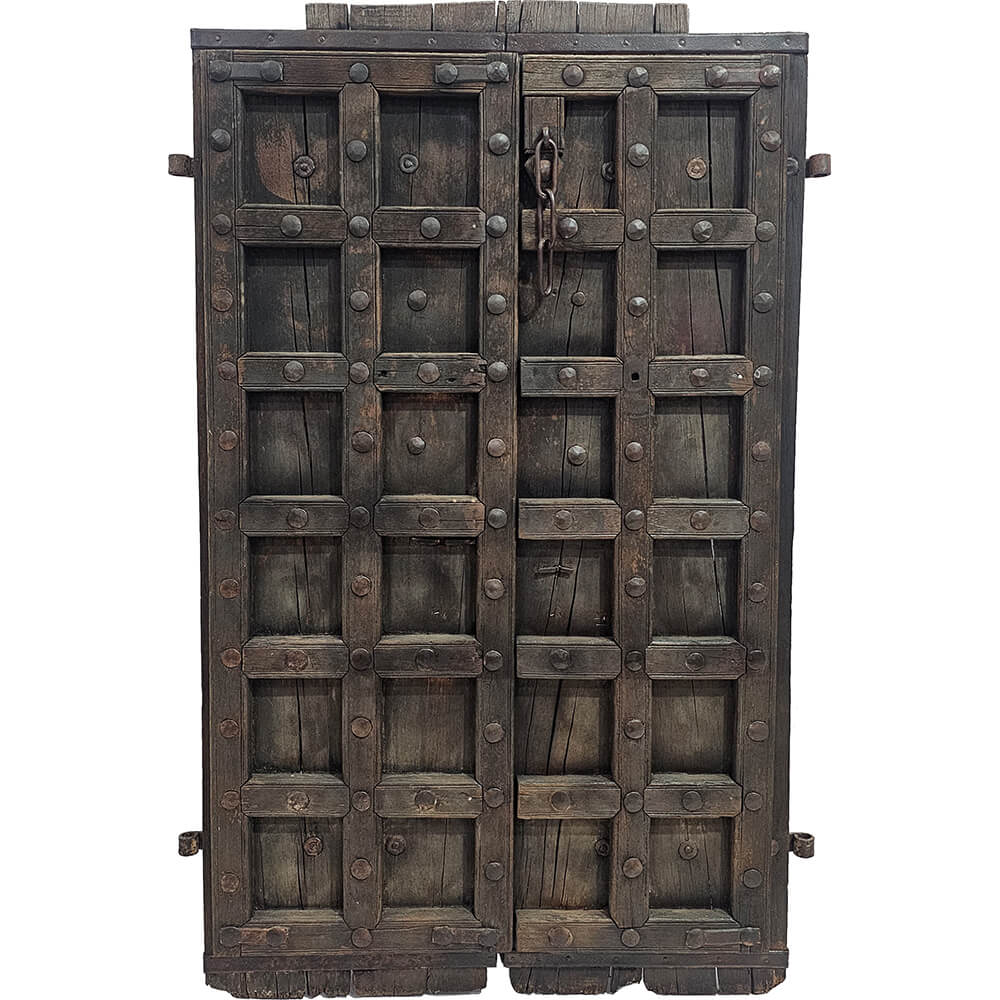 Denne gamle trædør er et stykke arkitektur med sjæl, patina og et strejf af mystik. Med sin solide konstruktion, rå jernbeslag og smukke spor af tidligere maling, har den stået vagt et sted i verden, hvor både hverdage og historier har passeret igennem. Træet er slidt med ynde og vidner om årtiers brug. Her er både charme og kant i rigelige mængder. Døren kan bruges dekorativt op ad en væg, som rumdeler, hovedgavl eller som det mest spektakulære blikfang, hvis du tør bruge den som dør igen. Unik og uperfekt på den helt rigtige måde. Denne dør er selvfølgelig One of a Kind.