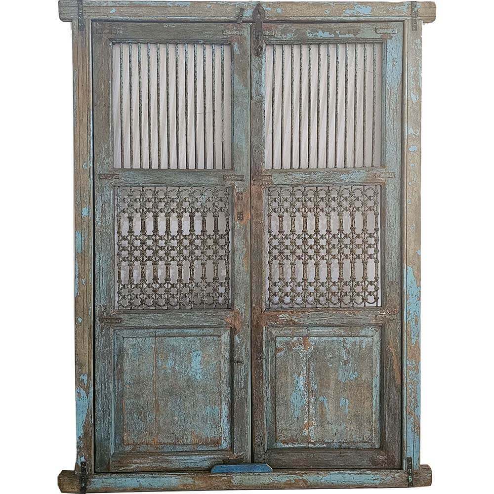 Denne rustikke dør med jerngitter er en sand skat fra gamle dage. Det slidte træ og den patinerede blågrønne farve fortæller historier om mange års brug. De indbyggede jerngitre tilføjer ikke kun en dekorativ detalje, men giver også et unikt spil mellem robusthed og elegance. Denne dør kan bruges som et karakterfuldt indretningselement, hvad enten det er som en skillevæg, en vægdekoration eller en indgang til et særligt rum. Den gamle dør bringer en rå charme og autentisk stemning ind i enhver indretning.