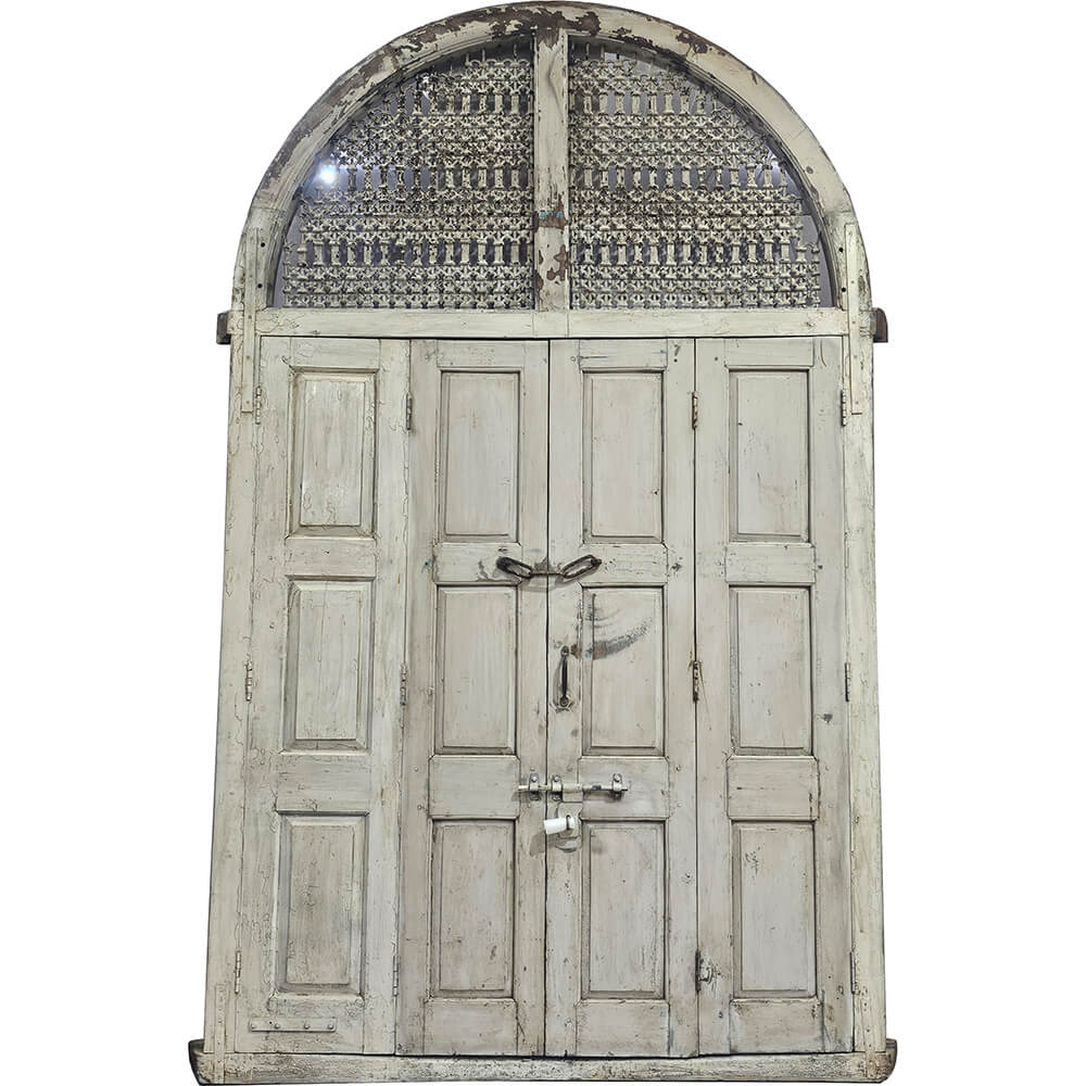 Denne store, gamle træport med rund bue er et imponerende og karakterfuldt element med masser af historie og patina. Portens buede overdel giver et blødt og arkitektonisk udtryk, som straks fanger blikket og tilfører rummet en særlig stemning. Den lyse, slidte overflade bærer tydelige spor af tidens gang med afskallet maling, små revner og naturlige farvevariationer, som kun ægte, gammelt træ kan have. Den øverste del er udført med et fint, gennembrudt trægitter, der tilfører lethed og detaljerigdom til det ellers solide udtryk. De kraftige fyldinger, originale beslag og låsemekanismer understreger portens autentiske oprindelse og solide håndværk.