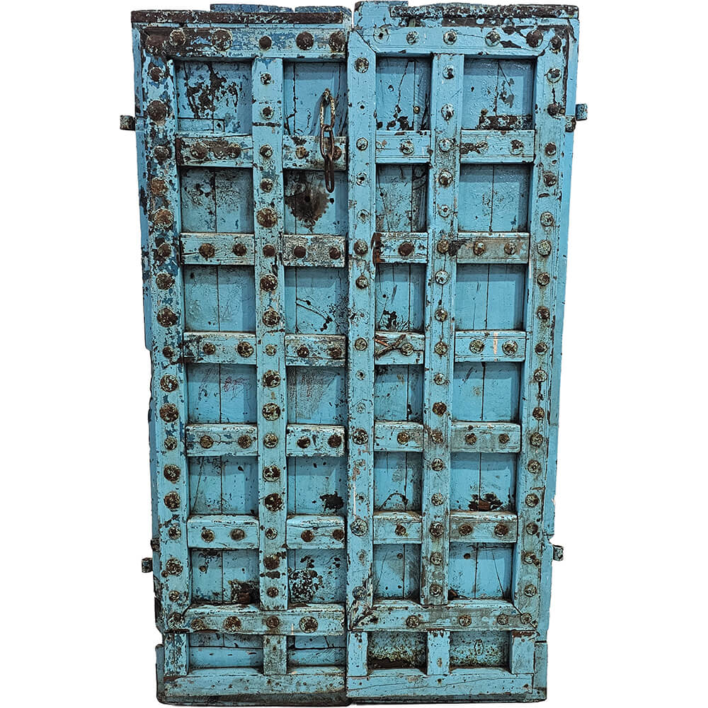 Denne flotte trædør i afdæmpet blå farve har et helt særligt udtryk, hvor patina og afskallet maling fortæller sin egen historie. De mange jernbeslag og nitter giver døren et råt og solidt look, som står i smuk kontrast til den slidte blå overflade. Farven varierer naturligt og giver liv og dybde, så døren aldrig virker ensartet eller kedelig.