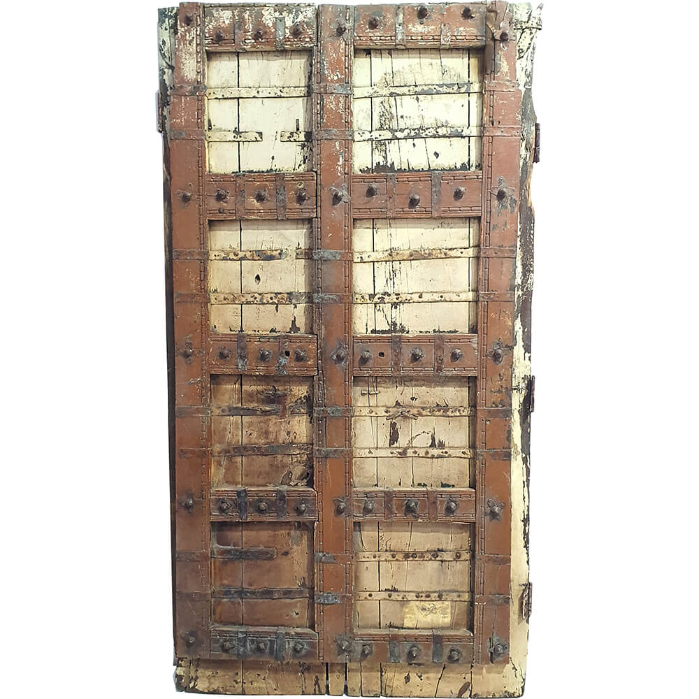 Denne imponerende gamle trædør er et sandt stykke historie med sin robuste konstruktion og autentiske patina. De kraftige trærammer med synlige bolte giver et råt, industrielt look, mens de slidte lyse brædder tilføjer et strejf af nostalgisk charme. Døren kan bruges som en karakterfuld vægdekoration, en cool sengegavl eller måske endda ombygges til et spektakulært bord. Trædøren emmer af autenticitet, perfekt til dig, der elsker møbler med en rå og ærlig fortid.