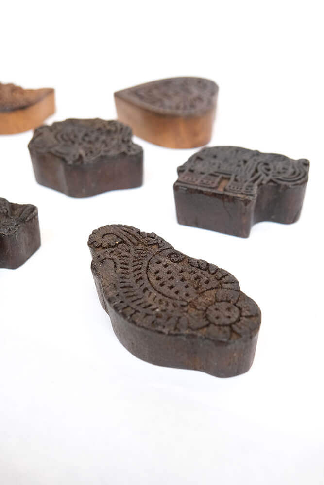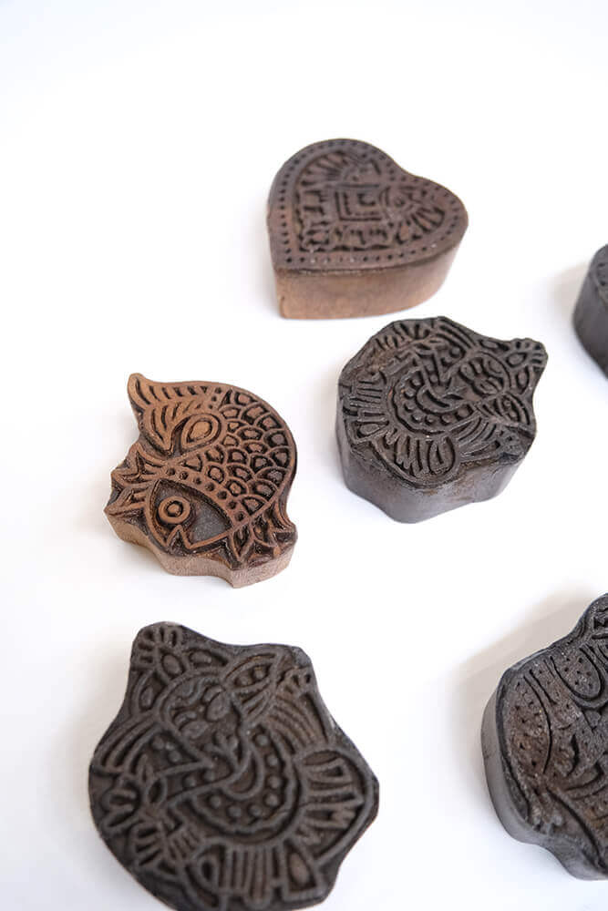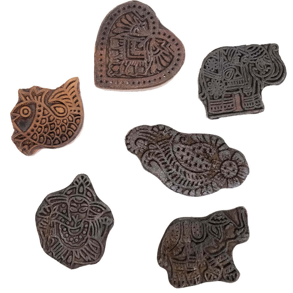 Disse fine træprintblokke har masser af karakter og inspiration hentet fra traditionelt håndværk. De udskårne motiver, som f.eks. fisk, elefant, blomst og hjerte, giver et legende og detaljerigt udtryk, uanset om du bruger dem til print på tekstiler, papir eller blot som pynt.