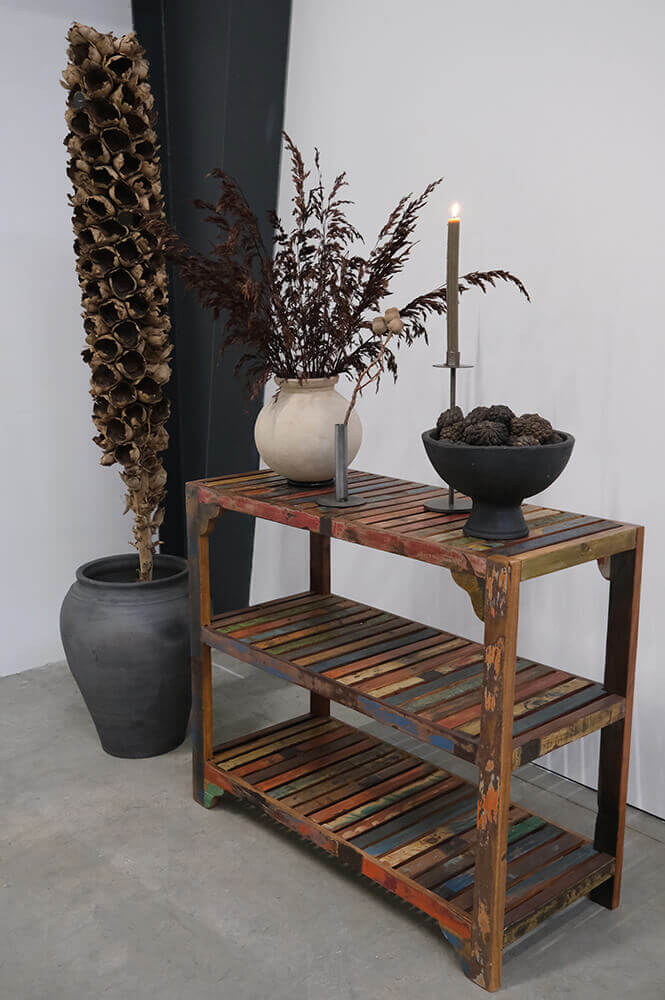 Denne reol er et fantastisk eksempel på, hvordan genanvendt træ kan skabe møbler med både sjæl og historie. Reolen er opbygget af lameller i genanvendt træ, hvilket giver den en unik karakter, hvor ikke to reoler er ens. Farverne på lamellerne varierer fra stykke til stykke og tilføjer et farverigt og levende udtryk.