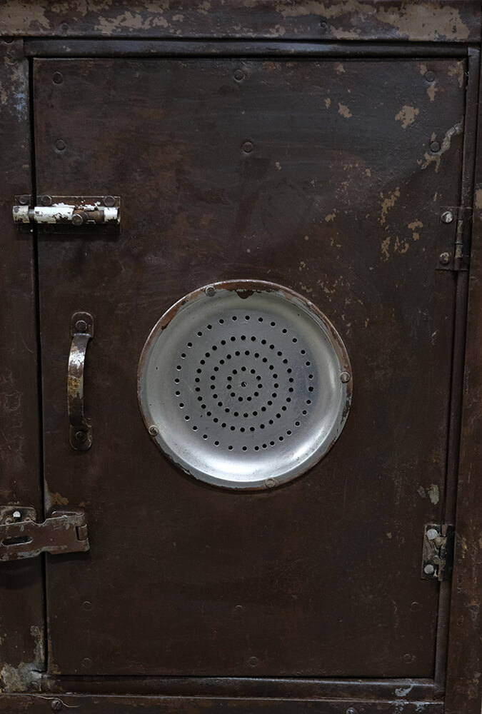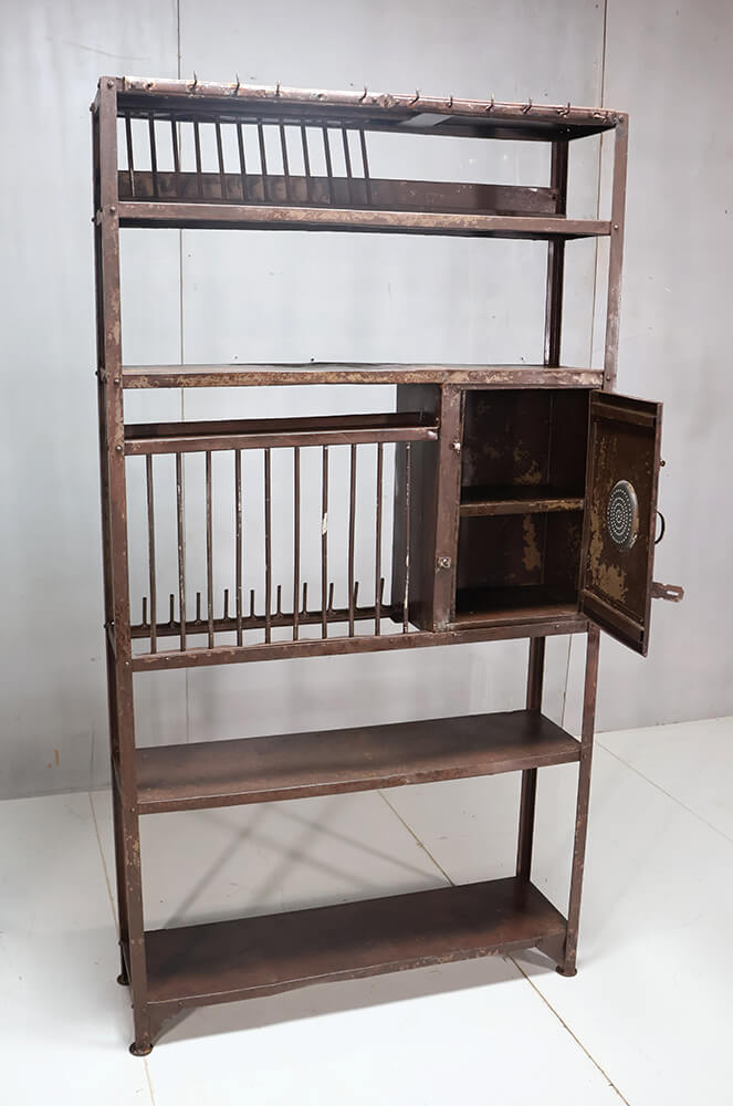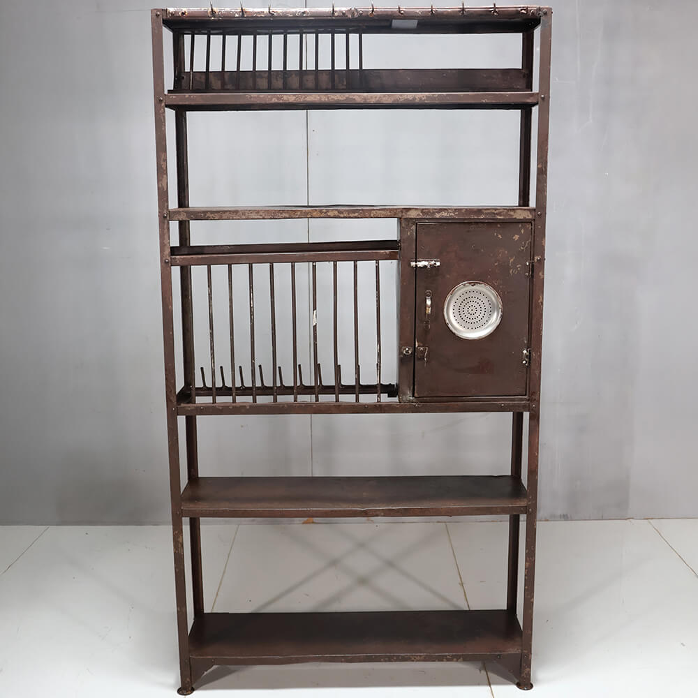 Denne gamle reol i metal har en rustik charme med sit patinerede look. Den er delt i tre sektioner med åbne hylder, en tallerkenholder og en skabslåge med et sjovt ventilationshul. Skabets rå og industrielle udtryk gør det til et iøjnefaldende møbel til ethvert rum, hvor det både kan skabe en autentisk stemning og fungere som praktisk opbevaring. Perfekt til et køkken med en rå stil eller til at give en industriel kant til en moderne indretning.