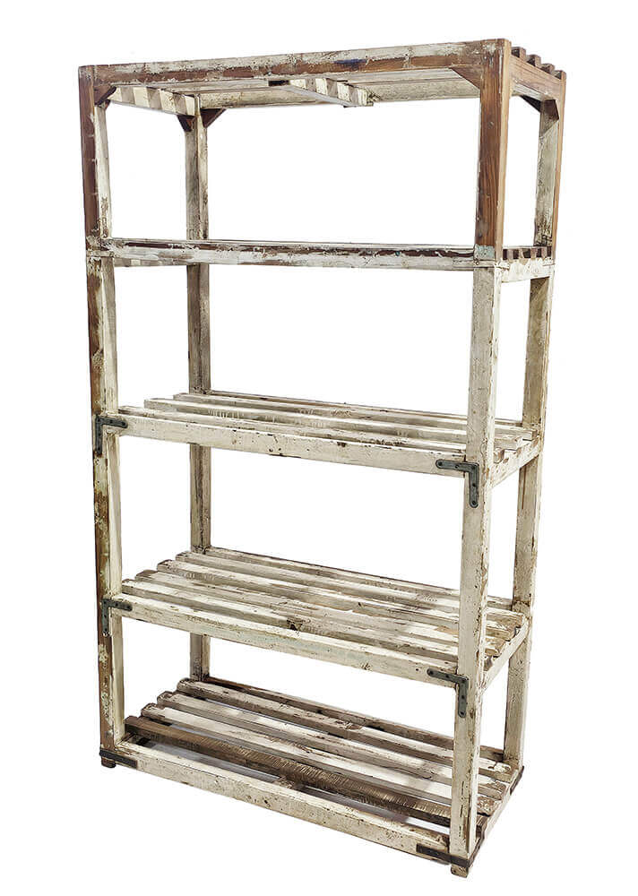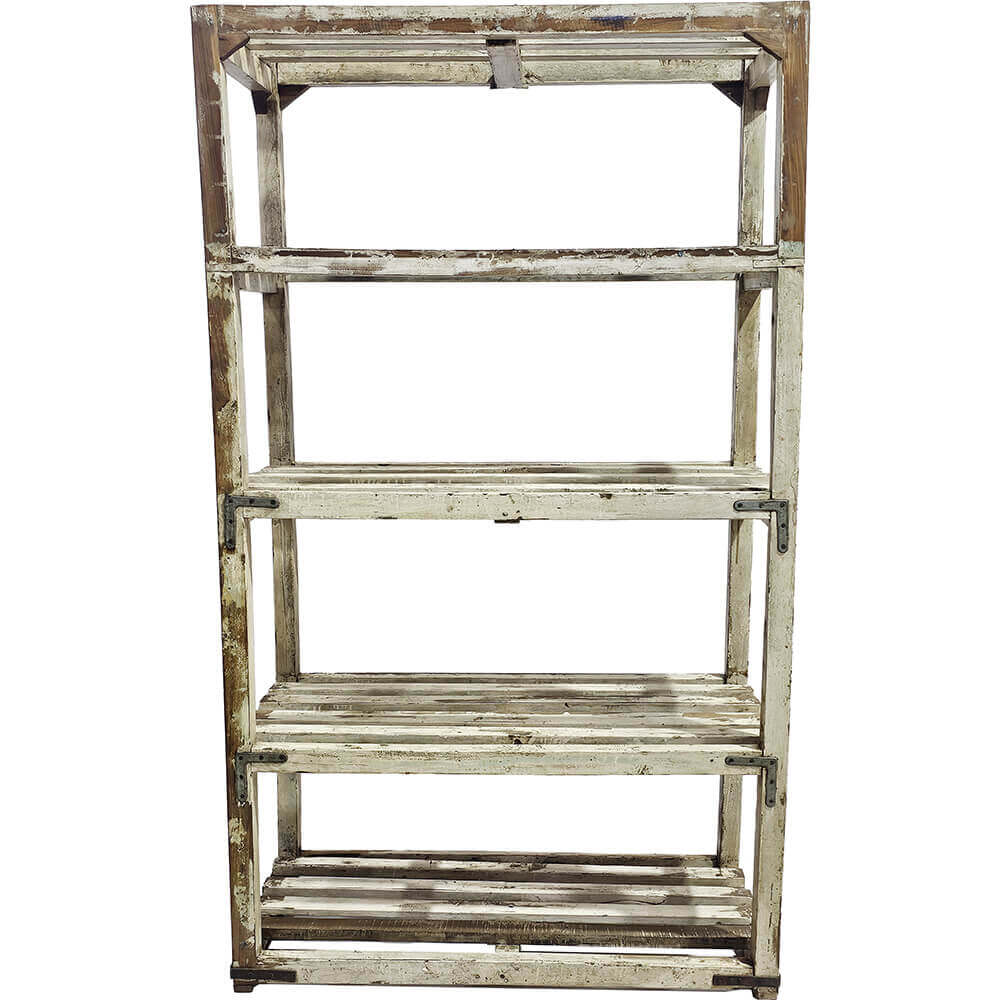 Denne vintage træreol er alt andet end kedelig. Den er lavet af massivt træ og har den slags cremefarvede patina, som kun tid og slid kan skabe. Med sit skæve udtryk og rå finish er det en træreol, der ikke forsøger at være fin, men som alligevel stjæler opmærksomheden i ethvert rum. Reolen er fundet i Indien, hvor den har haft et arbejdsliv bag sig. Det ses og mærkes. De slidte overflader, afskallede maling og solide jernbeslag fortæller en historie om funktion før pynt, og netop det giver reolen sin autentiske charme og sit rustikke look.