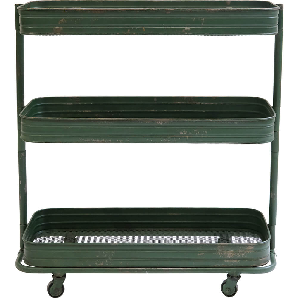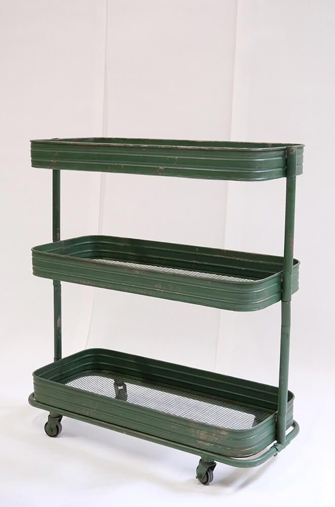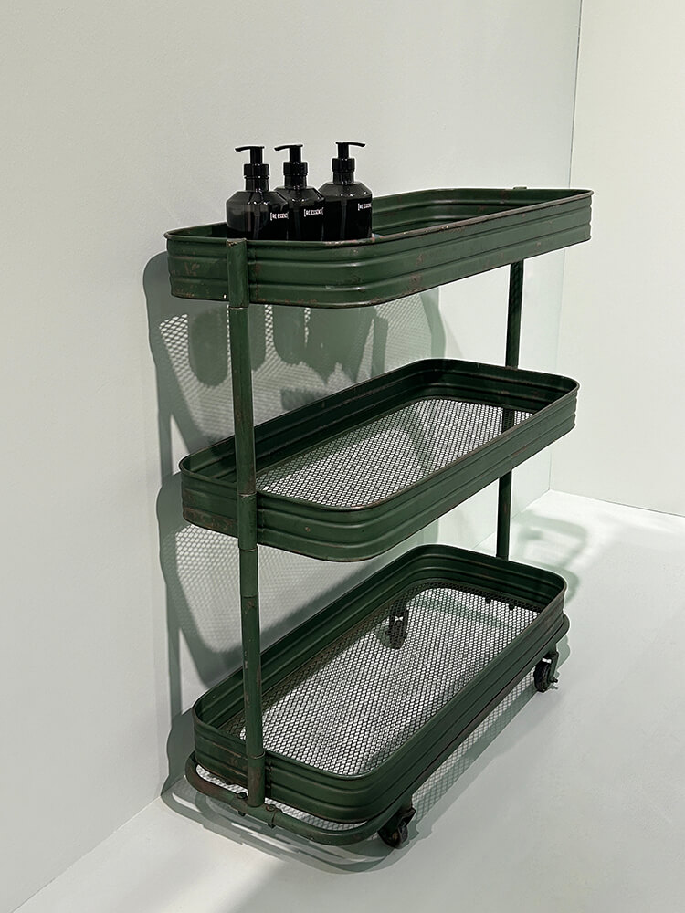 Denne reol på hjul er et “must have”. Charmerende og original i designet med det let patinerede og industielle look. Opbevaringsmøblet har 3 bakker med trådnet i bunden. Brug reolen på dekohjul i køkkenet til køkkenredskaber, på kontoret til skrivebordstilbehør, på badeværelset til håndklæder og toiletpapir, i sommerhuset eller kolonihavehuset til div. opbevaring. Rullebordet leveres usamlet.