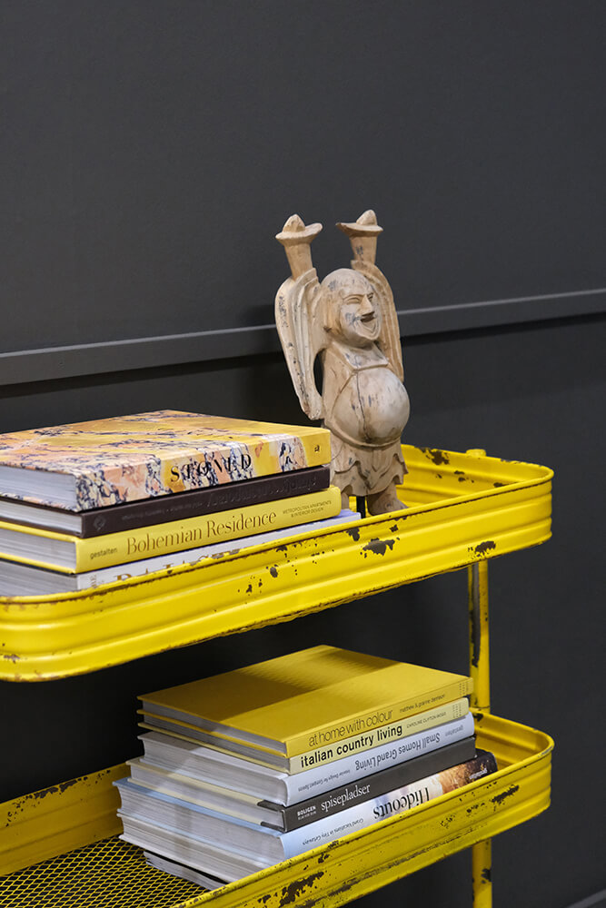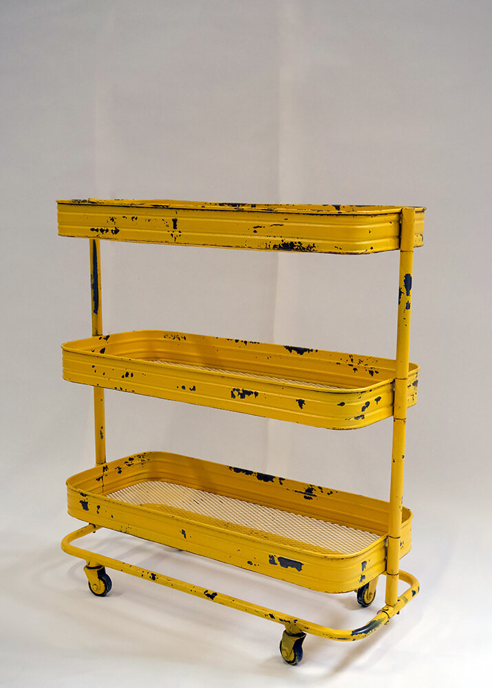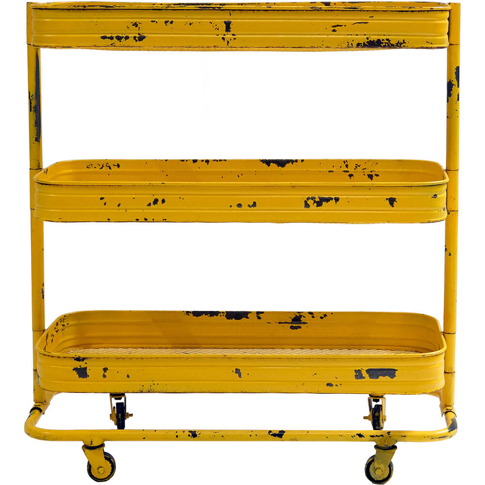 Dette rå og industrielle rullebord i en opsigtsvækkende gul farve med patinerede detaljer er både praktisk og dekorativt. De tre rummelige bakker har bund af trådnet, hvilket giver et let udtryk og gør det nemt at holde overblik over indholdet. Afstanden mellem midterste og øverste hylde er ca. 35 cm, mens afstanden mellem nederste og midterste hylde er ca. 29 cm, så der er god plads til opbevaring. Rullebordet har 4 dekohjul. Rullebordet er helt perfekt til caféer, restauranter eller som en cool detalje i din indretning. Leveres usamlet.