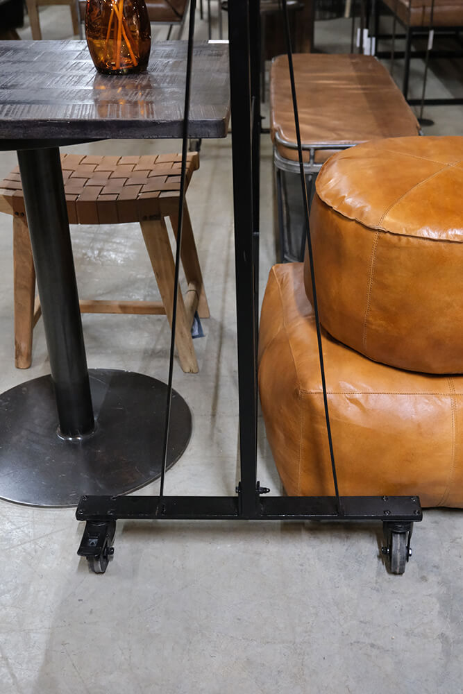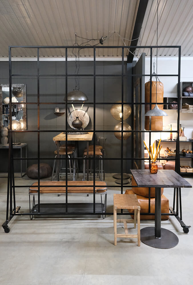 Flot, rå og praktisk skillevæg med hjul. Skillevæggen har et kvadratisk design med et sort jernstel uden glas. Denne skillevæg er genialt, når du ønsker en fleksibel ruminddeling, da hjulene gør at du kan flytte den rundt i din butik eller restaurant. Udnyt “vinduerne” til at hænge kroge i som du kan bruge som garderobe, til hængekrukker med planter eller noget helt tredie. Leveres usamlet i 3 dele.