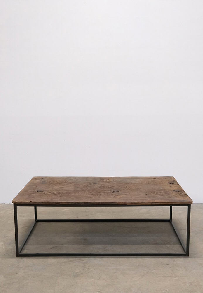 Sofabord med historie og masser af kant. Den unikke bordplade er en gammel dør der har de smukkeste udskæringer og en rustik patina, der fortæller sin egen historie. Stellet i klarlakeret jern giver sofabordet et moderne touch og sikrer stabilitet. Perfekt til dig, der elsker rustik, vintage design med autenticitet og charme.