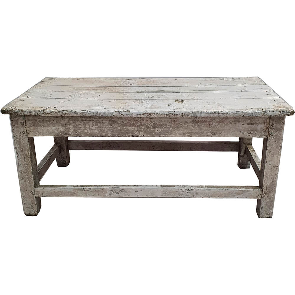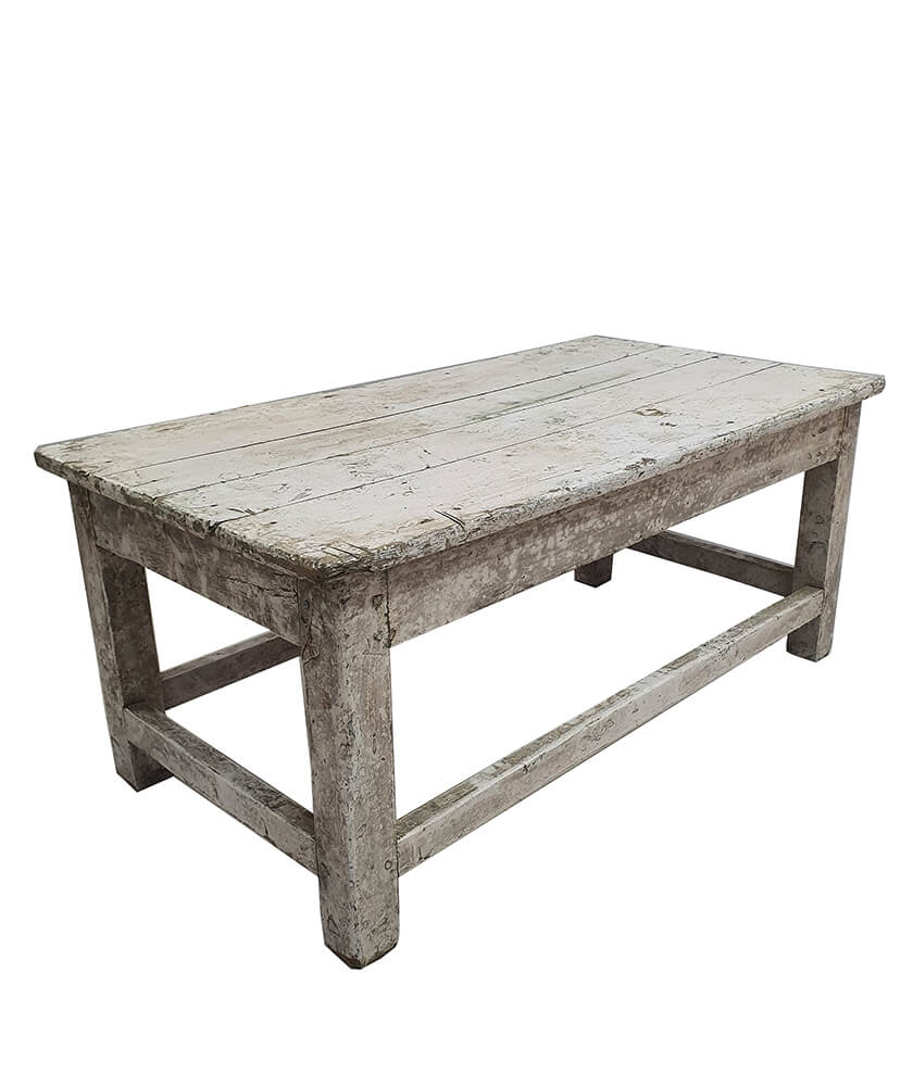 Dette gamle rustikke sofabord har et enkelt og solidt udtryk med masser af sjæl og patina. Bordet er udført i massivt træ og bærer tydelige spor af tidligere brug i form af slid, ujævnheder og en smuk, afskallet overflade, som giver det et autentisk og levende look. Den lyse, nedtonede farve passer flot ind i både moderne, nordiske og mere rå indretninger.