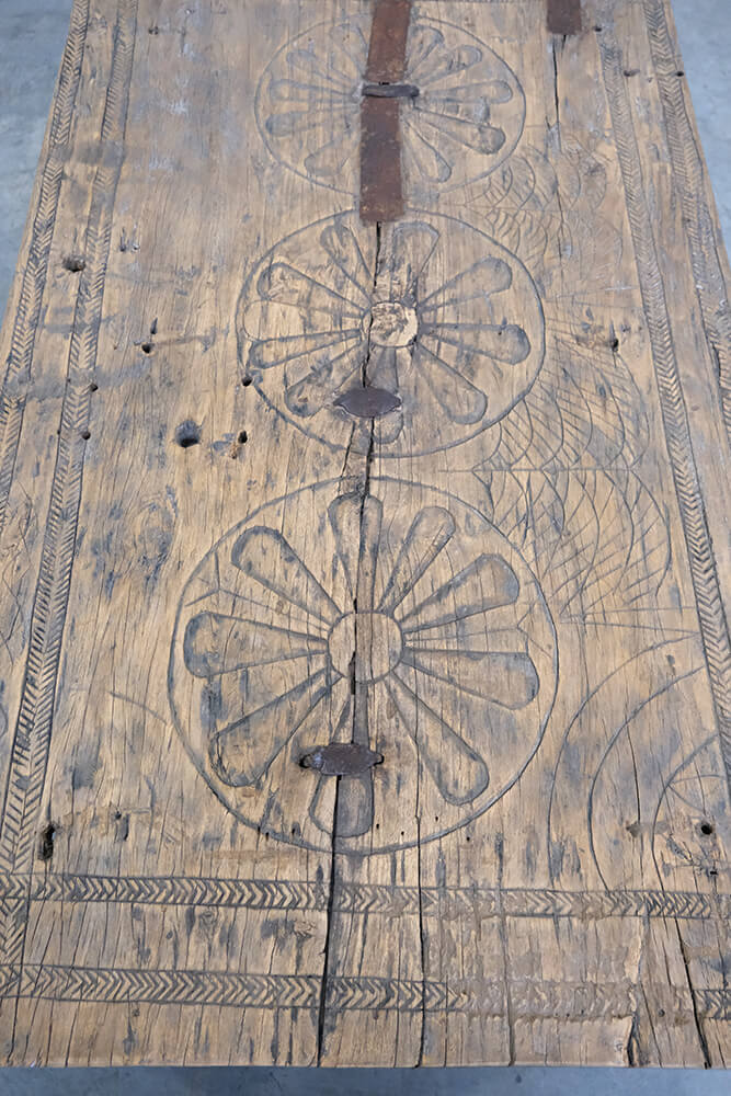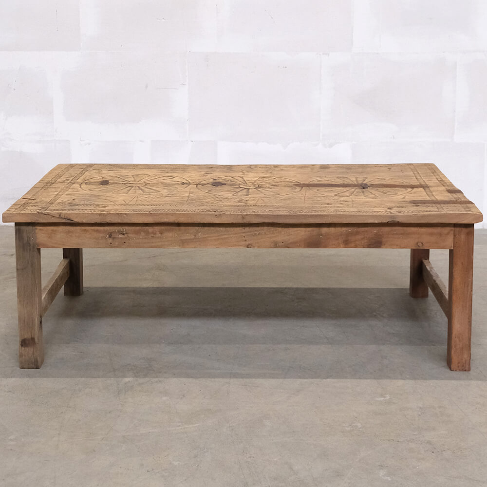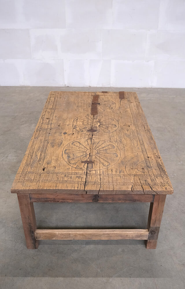 Dette sofabord udstråler historie og karakter med sin rustikke træbordplade, der er dekoreret med smukke, håndlavede udskæringer. Bordet er en skøn blanding af det autentiske og funktionelle, hvor de fine detaljer på bordpladen tilføjer et charmerende tvist til rummet. Med sit robuste design passer bordet perfekt ind i enhver indretning, der værdsætter vintage-stil og håndværk. Træets naturlige patina og alderstegn bidrager til en helt særlig stemning til dit hjem eller din butik.
