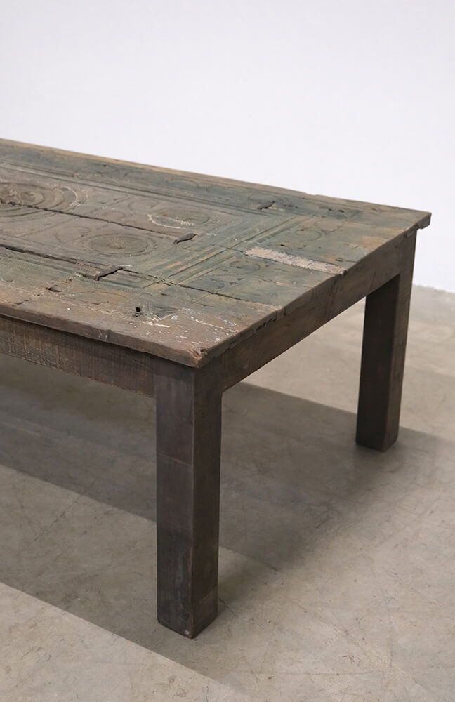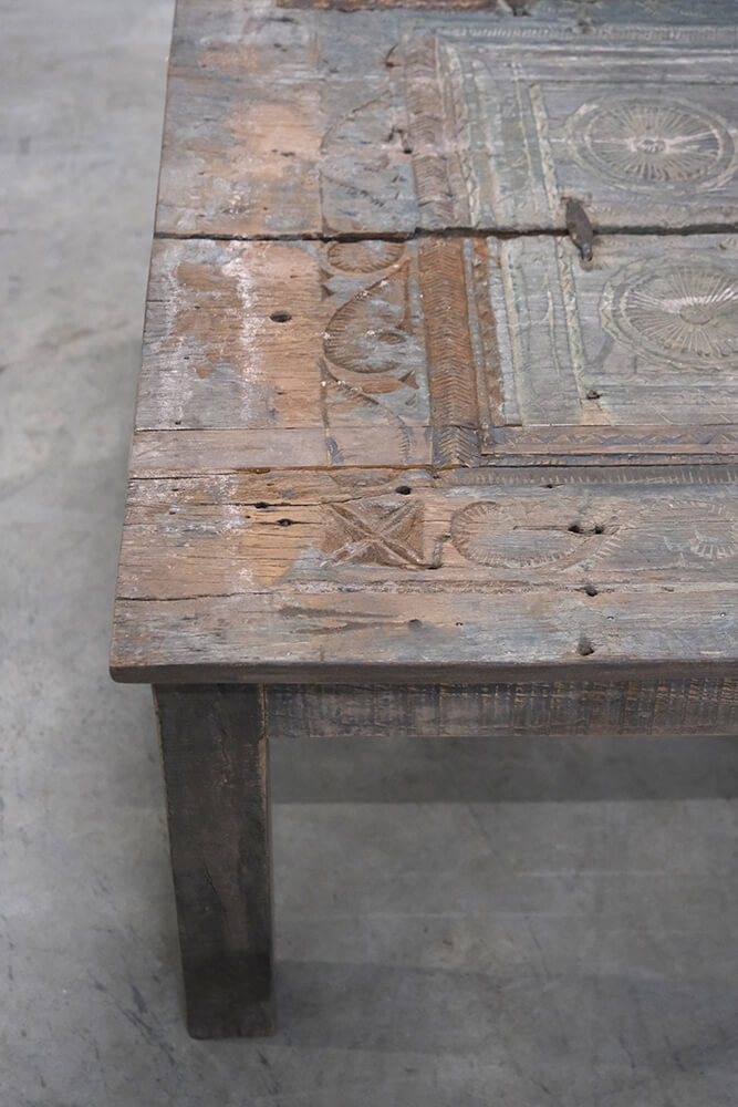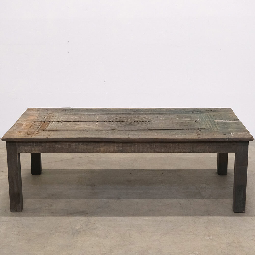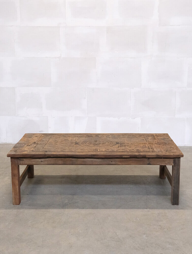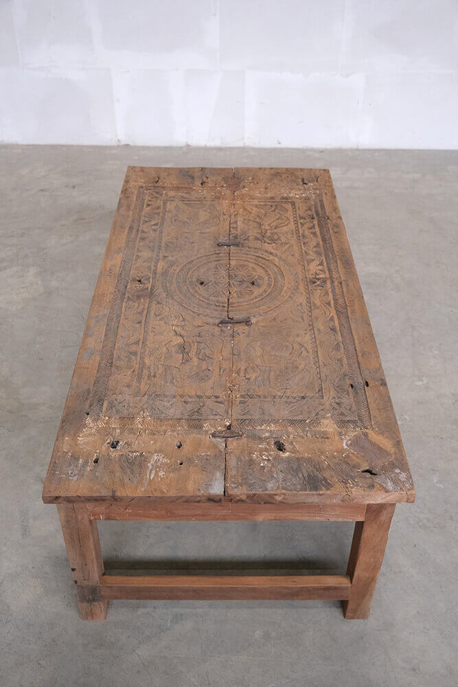 Dette unikke sofabord i træ har en rustik og autentisk charme, understreget af den smukke bordplade. Træet bærer tydelige spor af tidens tand med naturlig patina og slidmærker, som giver bordet en helt særlig karakter. De fine udskæringer på bordpladen tilføjer en ekstra dimension og gør det til et kunstnerisk og detaljeret møbel. Bordets størrelse er ideelt, hvis man ønsker et lidt større sofabord. Med sin robuste konstruktion og de synlige brugsspor er dette bord perfekt til indretninger, der værdsætter rå materialer og vintage-stil. Et enestående møbel, der tilføjer både sjæl og stemning til rummet.