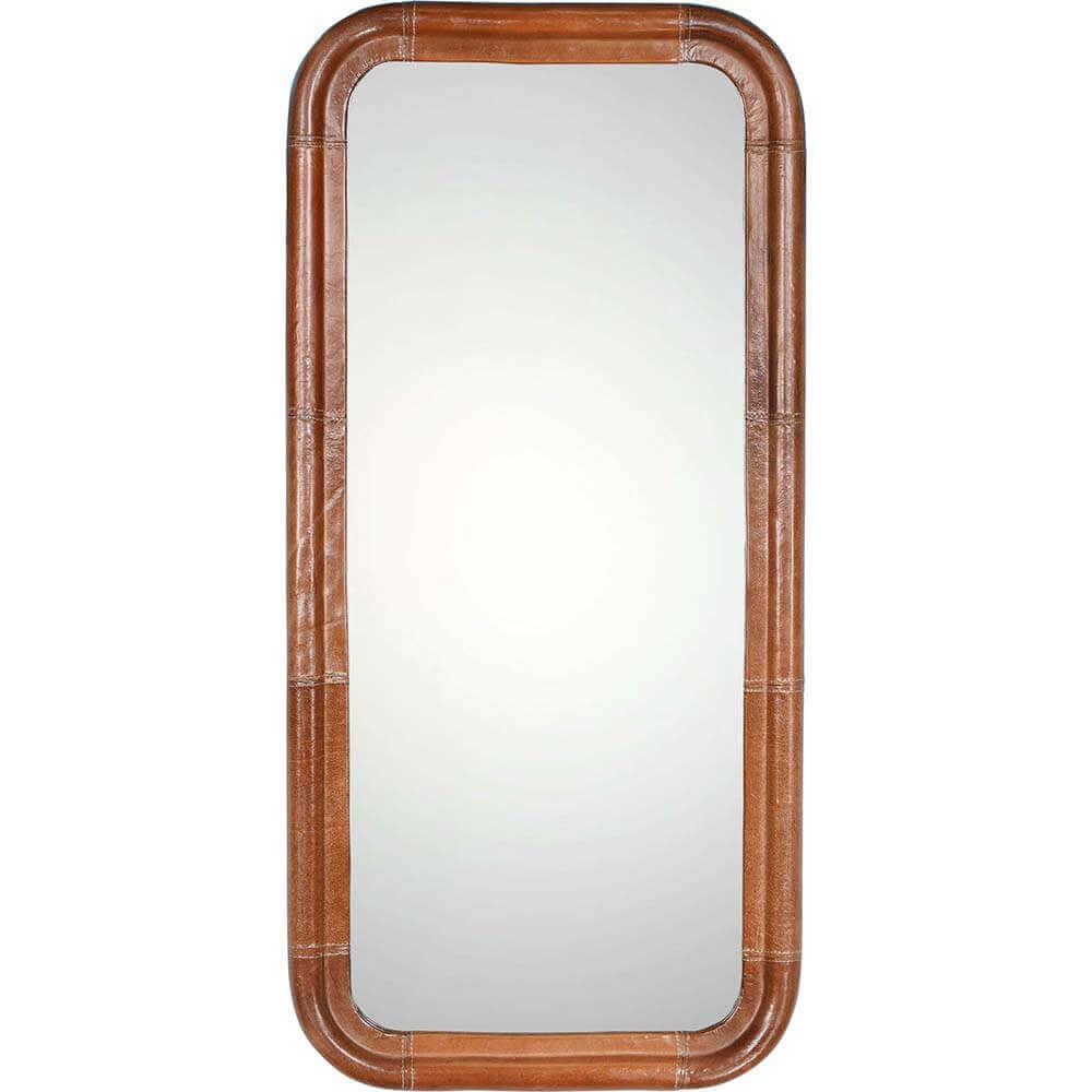 Dette spejl er indrammet i råt læder, der tilfører en charme i ethvert rum. Den bløde, afrundede ramme i lys brun læder giver spejlet et tidløst og klassisk udtryk, mens synlige syninger tilføjer et strejf af kant. Perfekt som både funktionelt spejl og dekorativt element, skaber det en luksuriøs atmosfære i alt fra entreen til soveværelset. Læderrammen gør spejlet robust og stilfuldt, hvilket gør det ideelt til at komplementere en moderne eller rustik indretning.