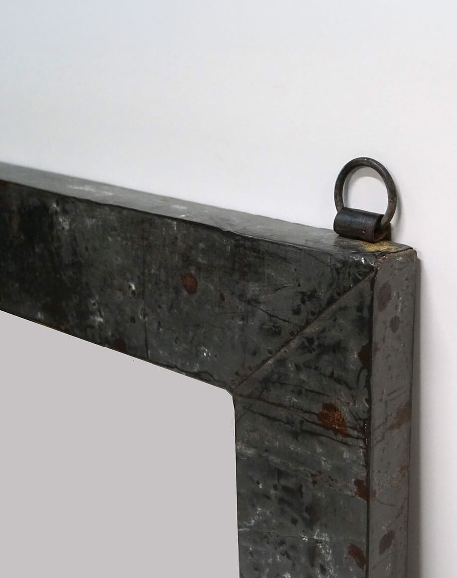 Råt spejl til væggen med en bred jernramme med en rustik patina. Dette store spejl kan bruges i hvilket som helst rum – soveværelse, entré eller garderobe, hvor det er mest praktisk at have et stort væghængt spejl frem for et gulvspejl.