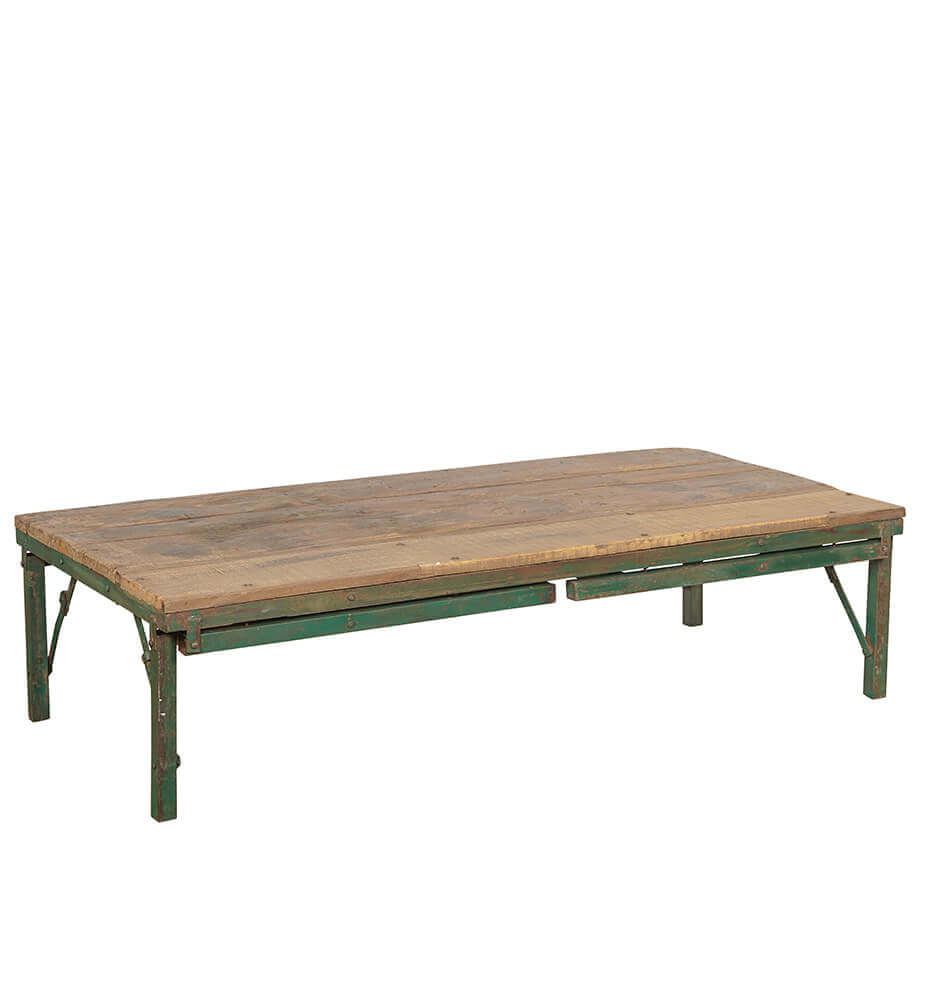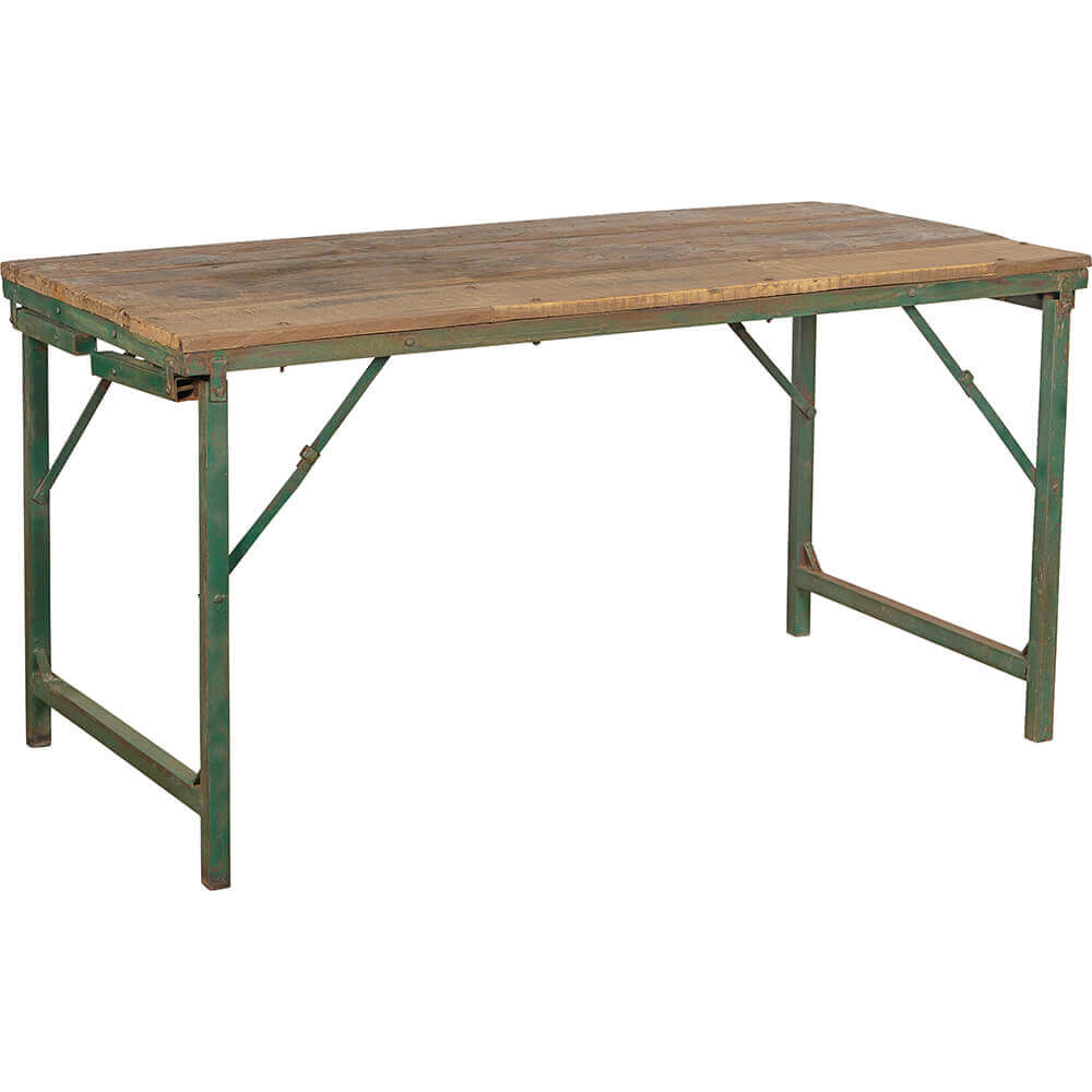 Her har du et bord, der nægter at blive sat i bås. Med sit foldbare, grønne jernstel og sin rustikke træbordplade kan det både bruges som spisebord i fuld højde og som lavt sofabord. Det hele afhænger af, hvordan benene foldes ud. Det er praktisk, råt og fleksibelt. Perfekt i butikker og udstillinger, hvor du kan skabe flotte, varierende niveauer med flere borde i samme stil. Og hjemme eller i caféen fungerer det lige så godt til middagen som til kaffekoppen. Et møbel med karakter og funktion i ét, og lidt af et røverkøb, hvis du spørger os.
