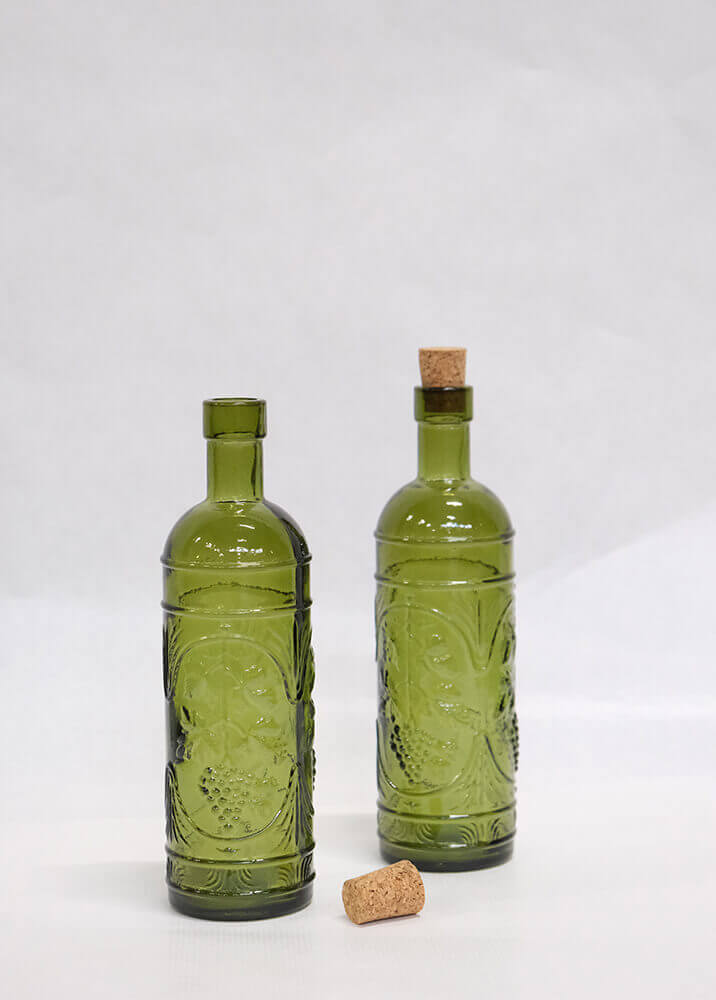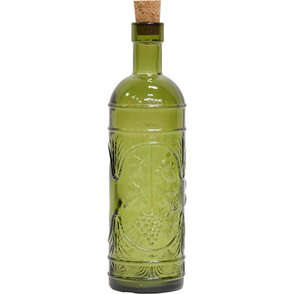 En flaske, der emmer af charme og vintage-stemning. Denne runde glasflaske er lavet af 100% genbrugsglas og prydet med et smukt, præget mønster, der giver den et helt særligt udtryk. Den klassiske korkprop fuldender looket og gør flasken lige så dekorativ, som den er praktisk.