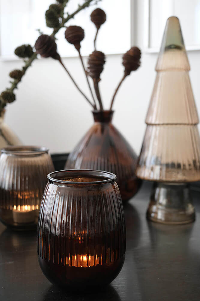 Med sin dybe, brune farve og bløde form tilføjer denne Aniston vase i genanvendt glas en varm kontrast til både lyse og mørke omgivelser. Den riflede overflade giver liv, når lyset falder på den, og du kan nemt bruge den som fyrfadsstage, hvis du ikke har en buket ved hånden. Kombinér den med Keaton-vasen og det matchende juletræ for et sammenhængende udtryk med varme og karakter.