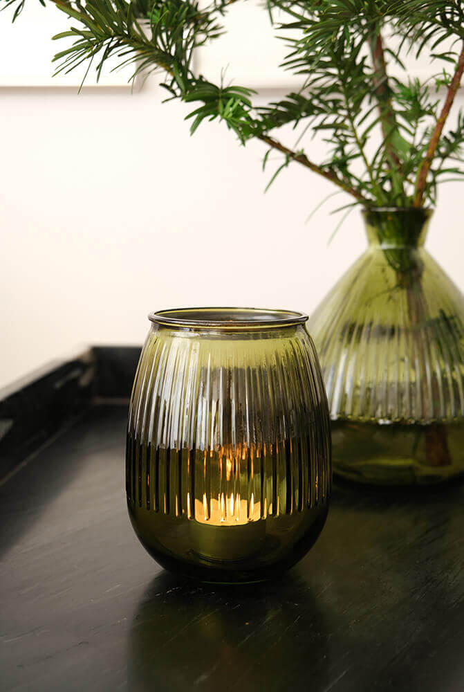 Denne olivengrønne Aniston vase er lavet af genanvendt glas og har det dér rolige udtryk, som passer ind hele året. Den riflede overflade giver spil i lyset, og vasens størrelse gør den ideel til både små blomster og fyrfadslys. Farven harmonerer smukt med grønne grene, naturlige materialer og de øvrige glasprodukter i serien, så som Keaton vasen og juletræet i samme farvetone.