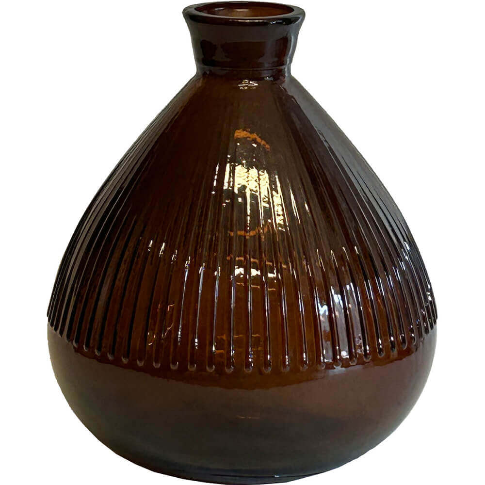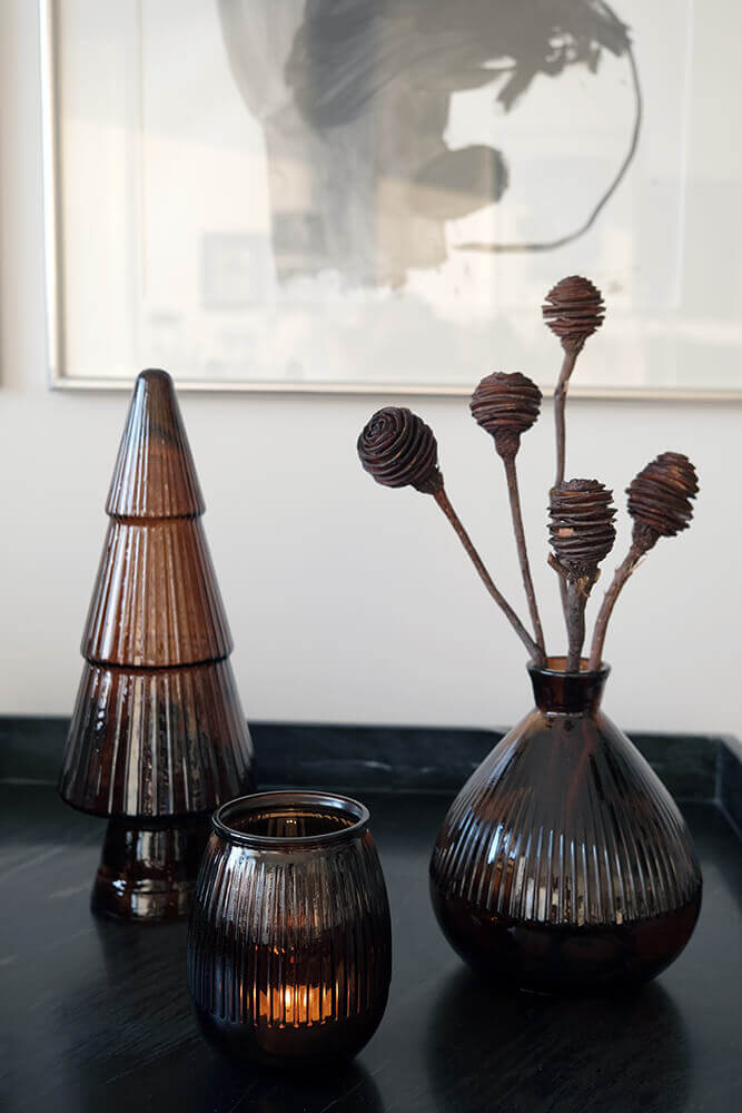 Den dybe chokoladebrune farve på denne Keaton-vase giver en fin kontrast til lysere omgivelser. Vasens runde form og riflede overflade, kombineret med det genanvendte glas, giver den karakter og tyngde. Fyld den med tørrede blomster eller lad den stå som den er. Farven gør den nem at matche med både Aniston-vasen og juletræet i samme farve, hvis du vil opnå et samlet udtryk med varme og dybde.